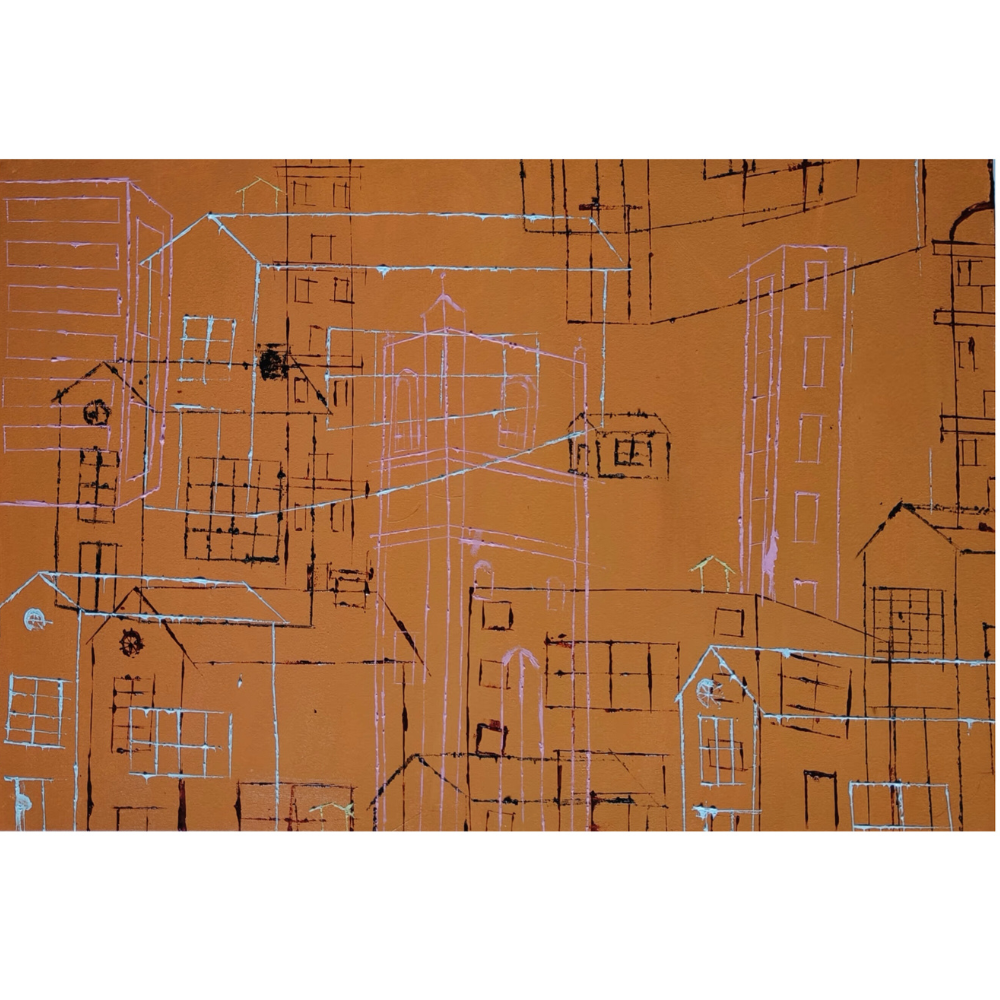 In Cityscape – Urban Blueprint, artist B. Manikanta captures the skeletal essence of a growing metropolis. Measuring 3 x 2 feet, this oil on canvas artwork features layered architectural line drawings in black, pink, and white over a rich terracotta base. Rather than depicting finished buildings, the piece evokes the feeling of an evolving city—its frameworks exposed, its structures sketched mid-formation. The composition suggests movement, memory, and imagination, offering a glimpse into the unseen grids and overlapping lives of urban development. This contemplative, abstract cityscape is perfect for collectors who appreciate architectural art, minimalist expression, and conceptual depth.