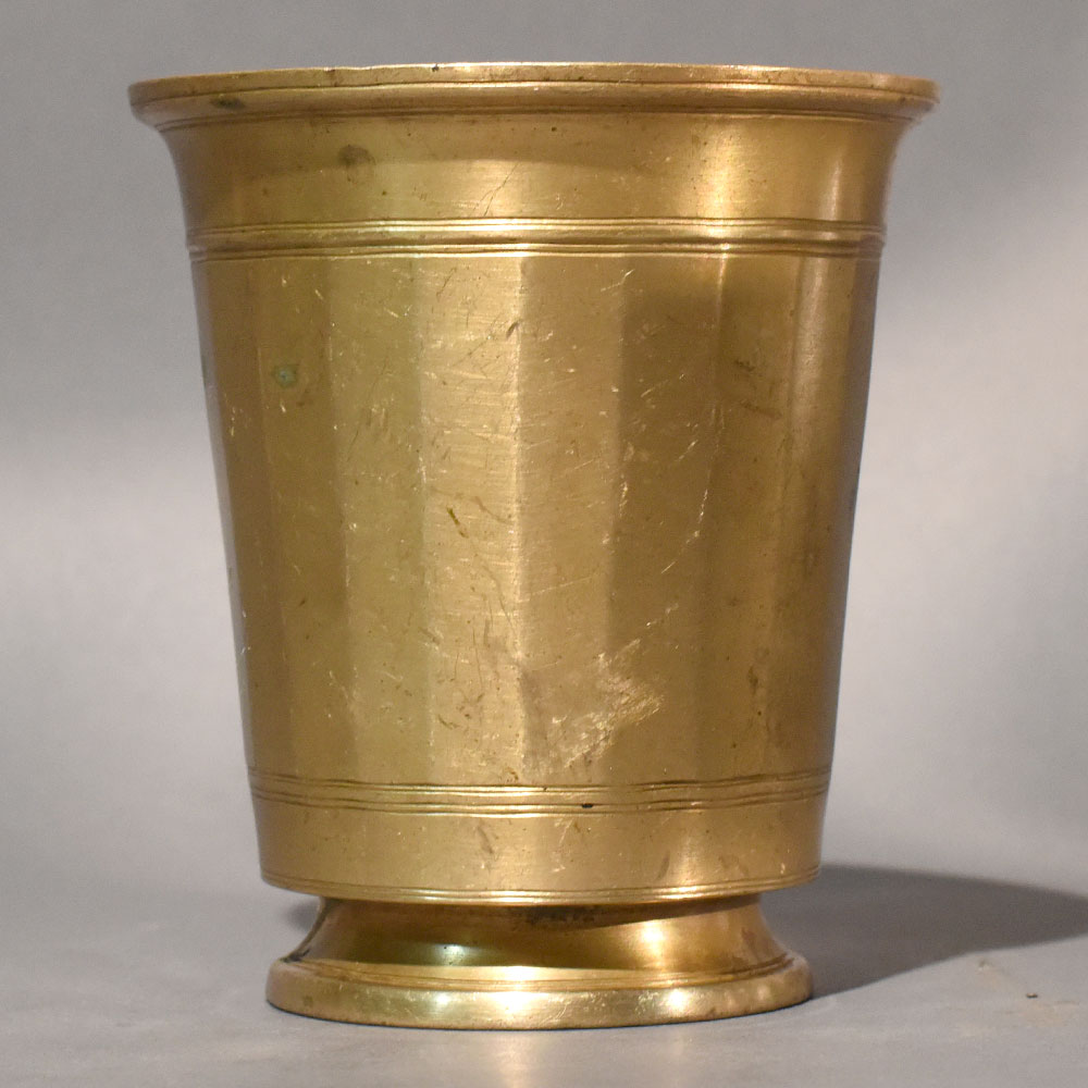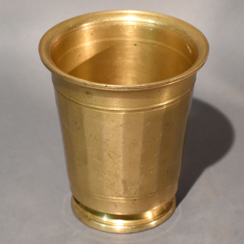 This classic brass pedestal ritual drinking vessel represents timeless Indian metal craftsmanship shaped for ceremonial and daily use. Designed with a wide, gently flared rim and a straight cylindrical body, the vessel stands firmly on a rounded pedestal base that adds stability and refined elevation. The proportions create a balanced silhouette suitable for traditional pooja arrangements and heritage dining settings. The surface displays a warm golden brass tone enriched with natural patina and subtle surface markings that highlight its handcrafted origin. Fine double-line band detailing near the rim and lower body introduces structured elegance without heavy ornamentation. The understated design allows the material and form to speak for themselves, reinforcing its authentic traditional character. The interior is smoothly finished, making it practical for holding sacred water, milk, panchamrit, or other ritual offerings. Brass vessels are widely respected in temple traditions and Indian households for their durability, cultural significance, and long-term usability. This piece integrates seamlessly into daily prayer rituals, festive ceremonies, or decorative altar displays. The sturdy pedestal base slightly elevates the vessel, giving it ceremonial prominence while ensuring secure placement. Solid brass construction ensures strength and longevity, while natural tonal variations guarantee that each piece carries individual character.