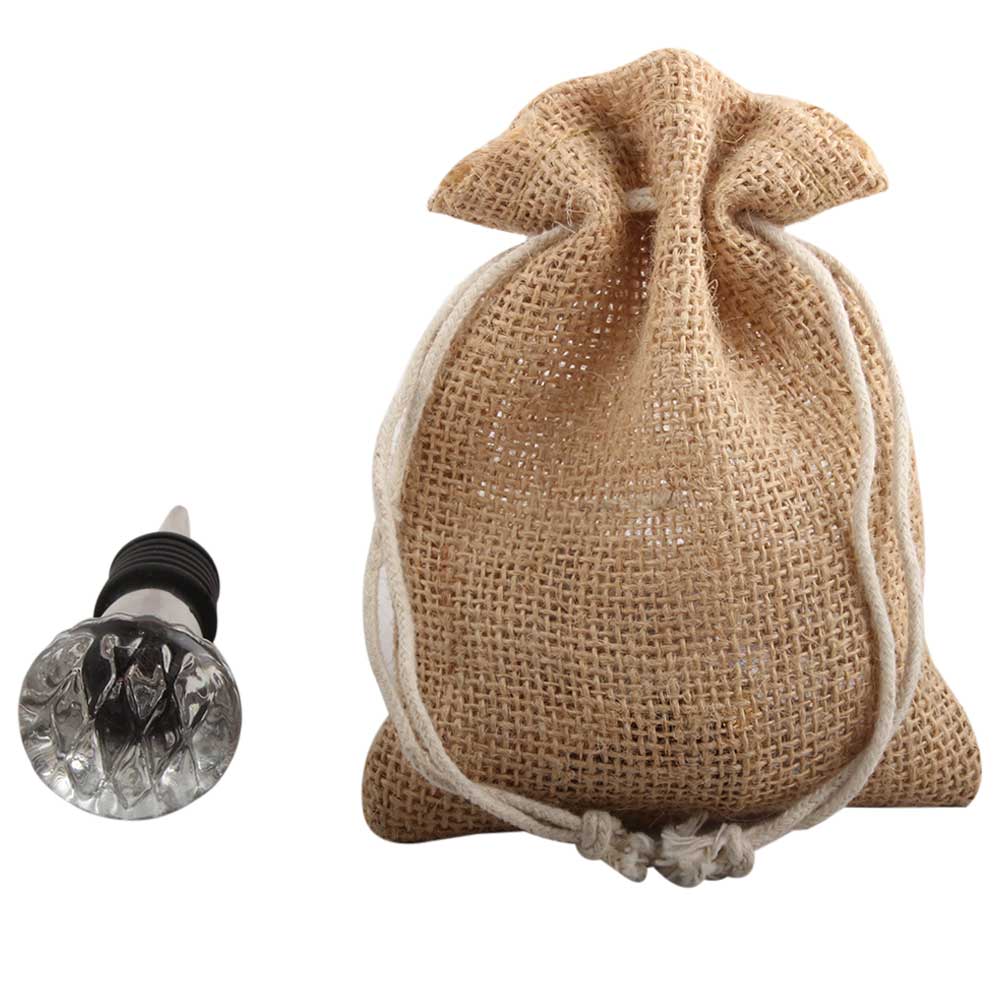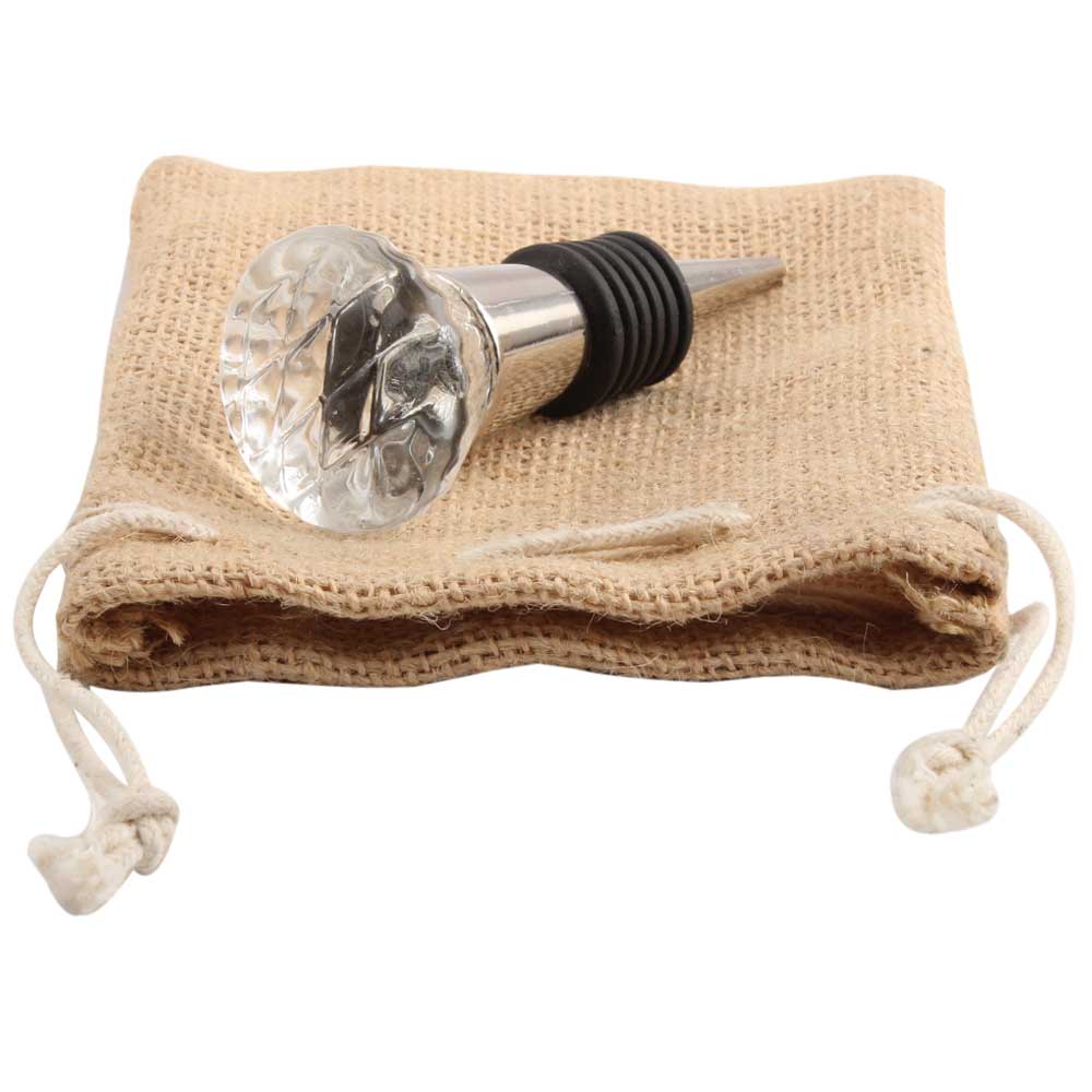 Clear Cut Oval Shape Glass Wine Stopper. Zinc Alloy Wine Bottle Stopper with Attractive Jute Bag Packaging.