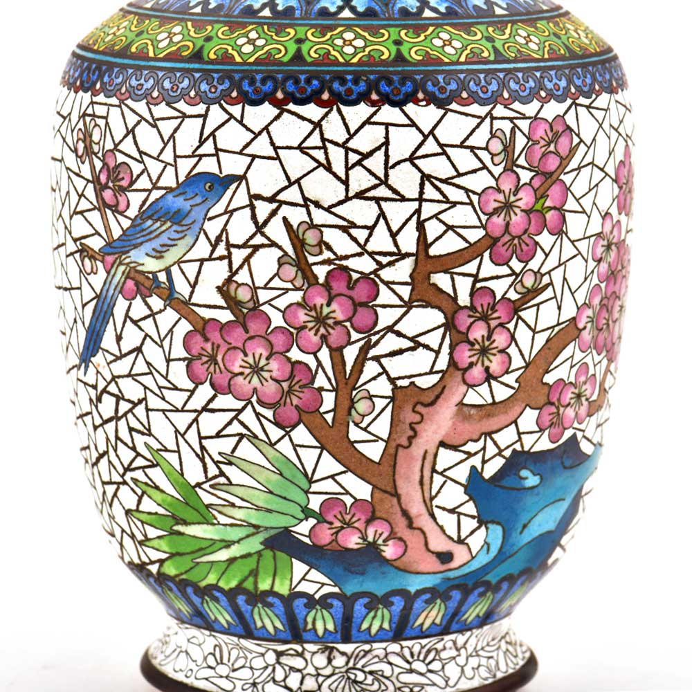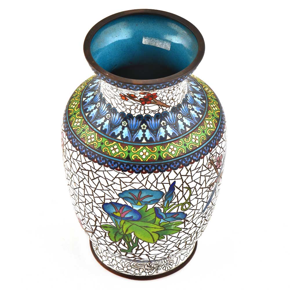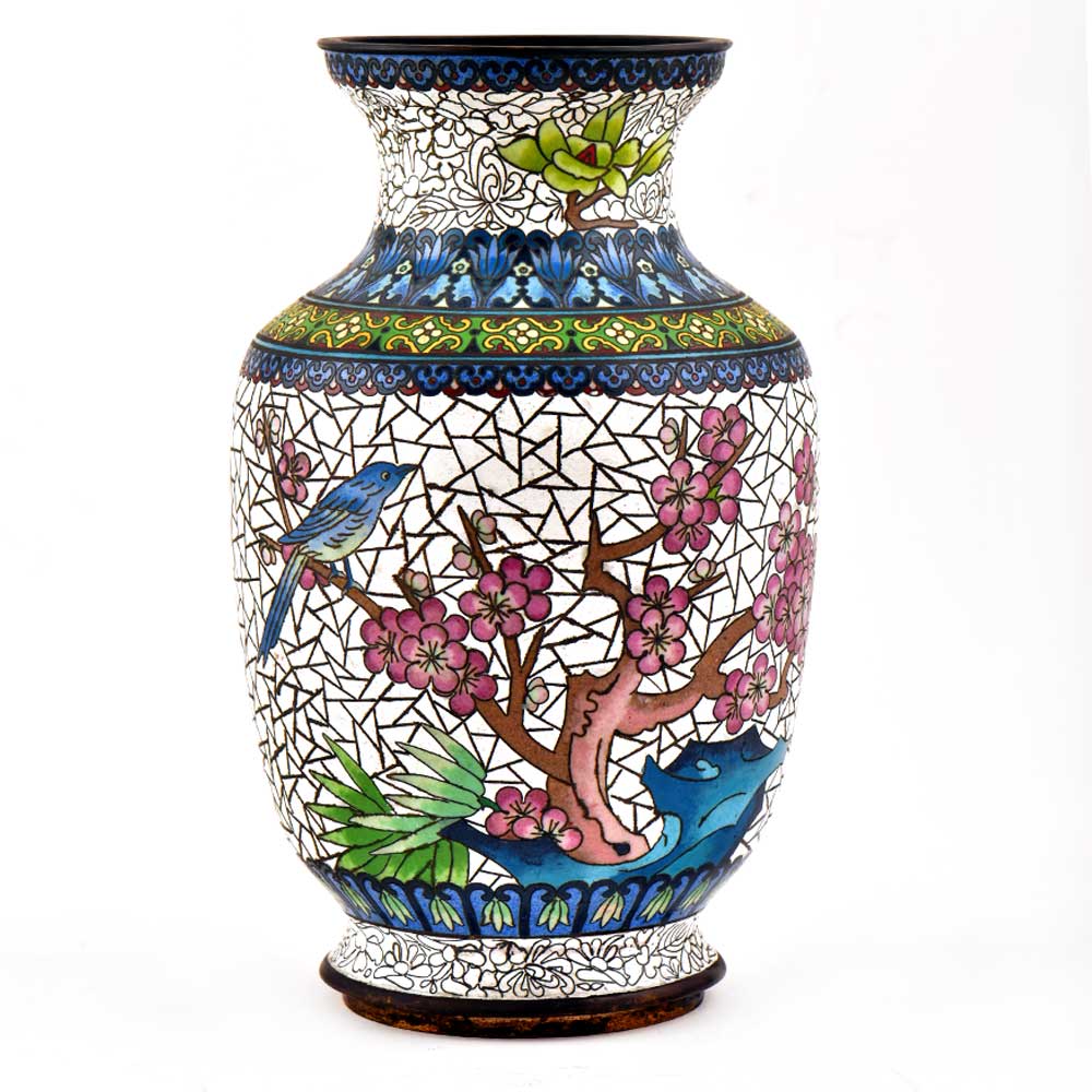 Decorative enameled metal ware called cloisonné exhibit almost superhuman skill by master craftsmen displayed by the marvelous diversity, intricacy and beauty of their designs. Earliest decorative motifs include cloud patterns, lotus flowers, the symbol of purity and beauty later motifs included dragons amid clouds, floral landscapes, scenes from court and mystical animals. Exquisitely detailed petals and leaves with fine color gradations. Fine inlaid wirework at neck and base, which are edged in brass. Exquisitely detailed petals and leaves with fine color gradations. Dark cobalt blue ground with white, rust, orange, yellow, and mauve blossoms; foliage in shades of green edged in rust are some of the popular designs of cloisonné.