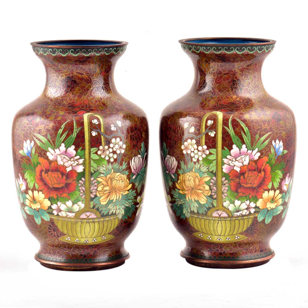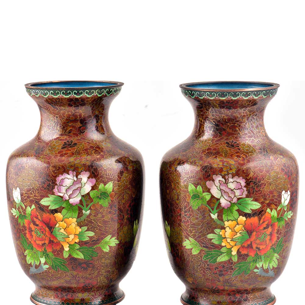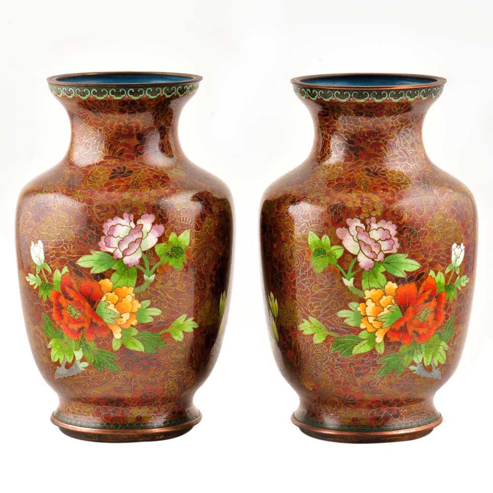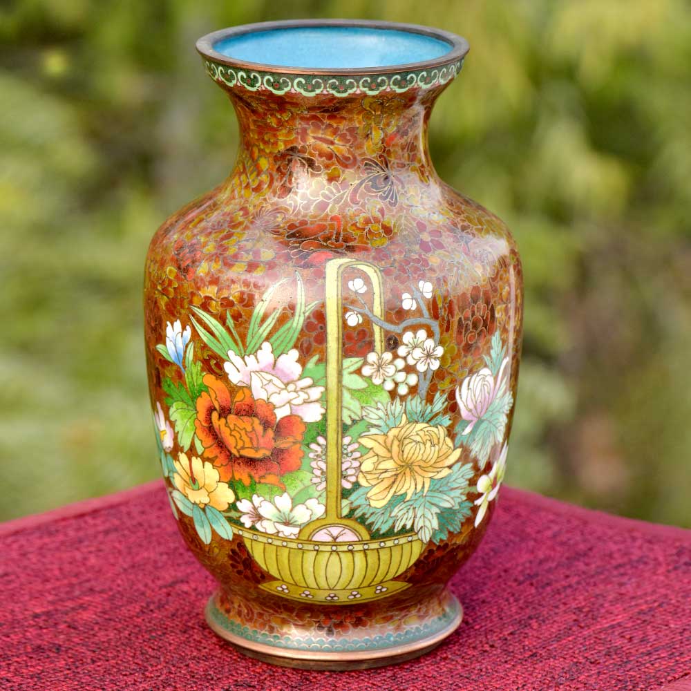 Decorative enameled metal ware called cloisonné exhibit almost superhuman skill by master craftsmen displayed by the marvelous diversity, intricacy and beauty of their designs. Earliest decorative motifs include cloud patterns, lotus flowers, the symbol of purity and beauty later motifs included dragons amid clouds, floral landscapes, scenes from court and mystical animals. Exquisitely detailed petals and leaves with fine color gradations. Fine inlaid wirework at neck and base, which are edged in brass. Exquisitely detailed petals and leaves with fine color gradations. Dark cobalt blue ground with white, rust, orange, yellow, and mauve blossoms; foliage in shades of green edged in rust are some of the popular designs of cloisonné