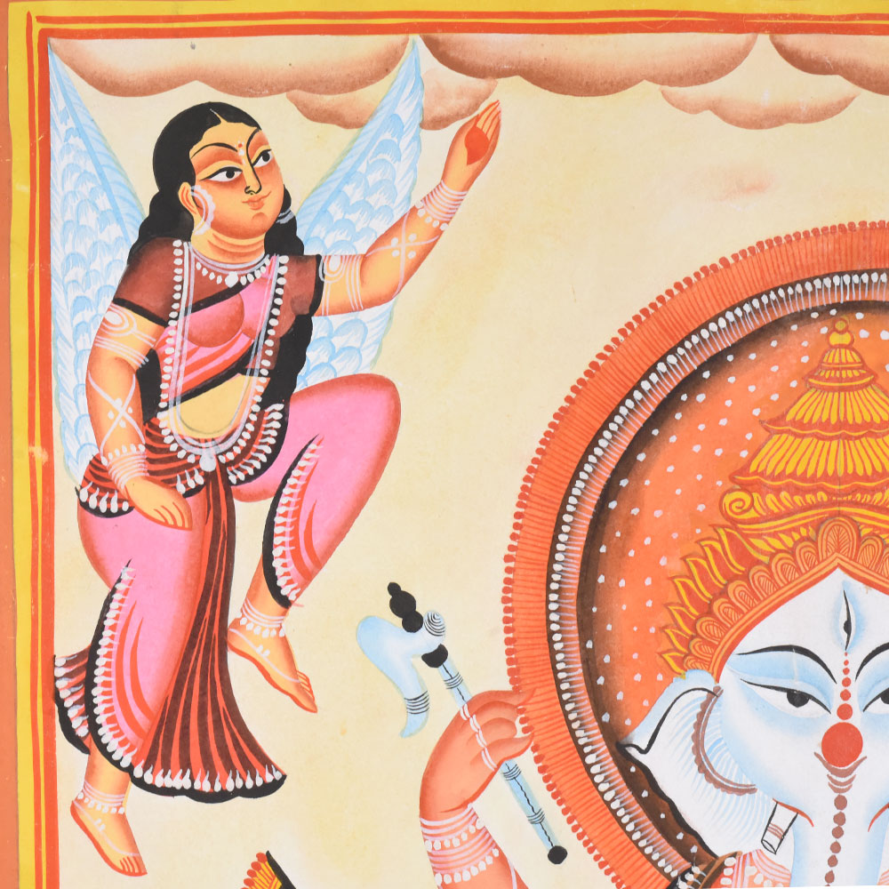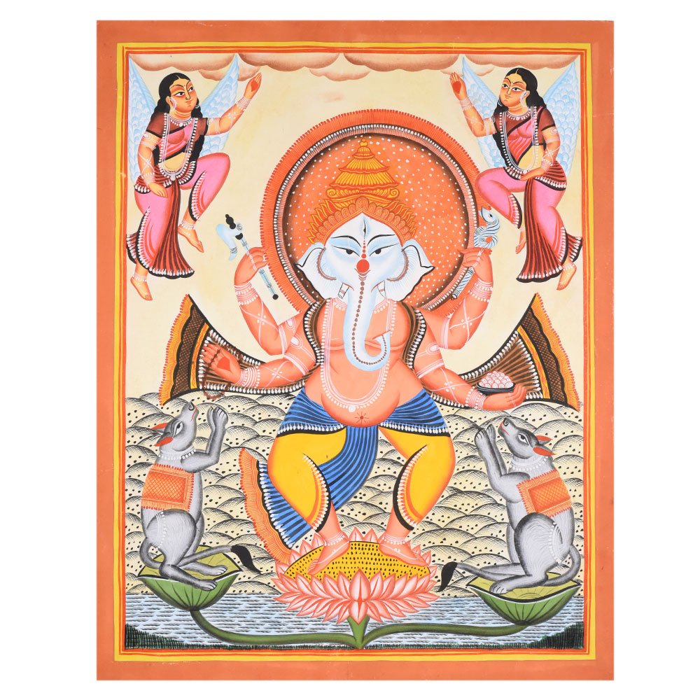 Central dancing figure of Lord Ganesha standing on a lotus pedestal Two mice shown as devoted attendants in symmetrical poses Winged celestial figures above, adding movement and celebration Bold outlines, flat vibrant colors, and decorative borders typical of Kalighat styleProduct Specification
