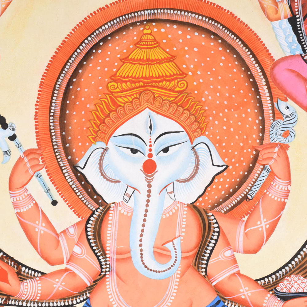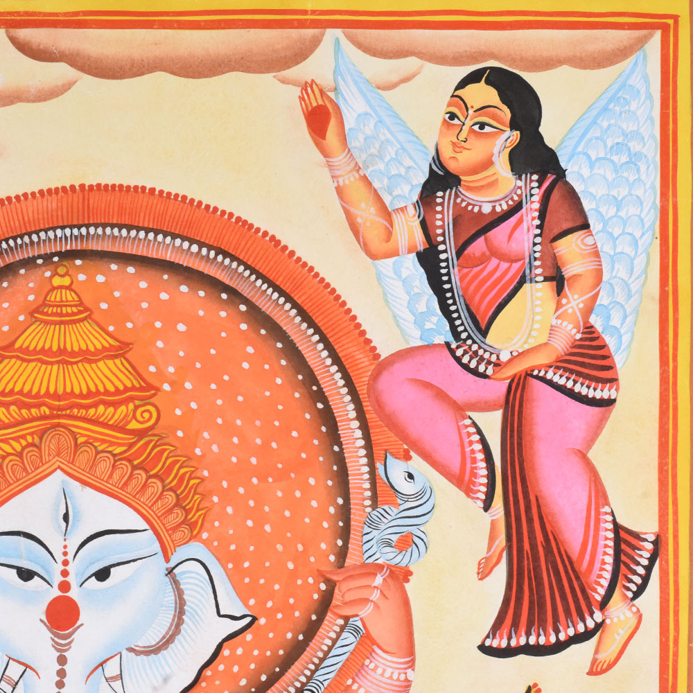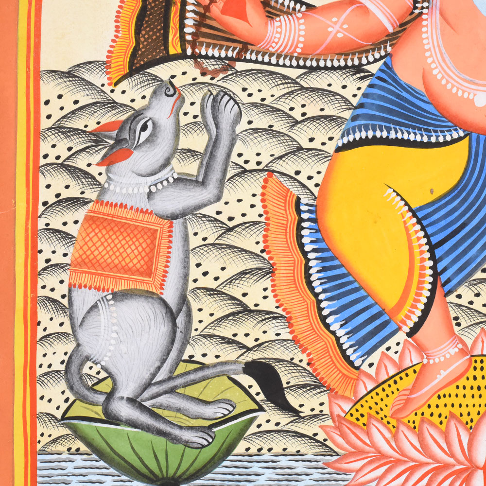 This Kalighat painting on cloth and paper presents a vibrant and auspicious depiction of Lord Ganesha in a dancing posture, rendered with the bold clarity and devotional warmth characteristic of the Kalighat tradition. Ganesha stands at the center upon a blooming lotus that rises from gently rippling water, symbolizing purity and spiritual awakening. His elephant head, elongated trunk, and calm, half-closed eyes convey wisdom and benevolence, while his dynamic stance introduces a sense of rhythm and divine movement. Multiple arms extend outward, each holding ritual objects or forming symbolic gestures associated with protection, prosperity, and the removal of obstacles. Flanking Ganesha on either side are two grey micehis traditional vahanasshown standing upright with folded hands in devotion. Their mirrored poses add symmetry and a touch of narrative charm to the composition. Above, two winged celestial attendants descend from the sky, their raised arms and flowing garments suggesting celebration and divine approval. A glowing circular halo behind Ganeshas crown emphasizes his sacred presence and anchors the composition visually. The background is filled with patterned earth and water motifs, rendered through repetitive lines and dots that create texture while maintaining the flatness typical of Kalighat painting. The color palette is lively and harmonious, dominated by warm oranges, reds, yellows, and soft blues, outlined with strong black contours. Decorative borders frame the scene, enhancing its iconic, shrine-like quality. Executed on cloth and paper, the painting reflects the Kalighat artists ability to combine religious symbolism, folk aesthetics, and visual storytelling into an accessible yet powerful devotional image.