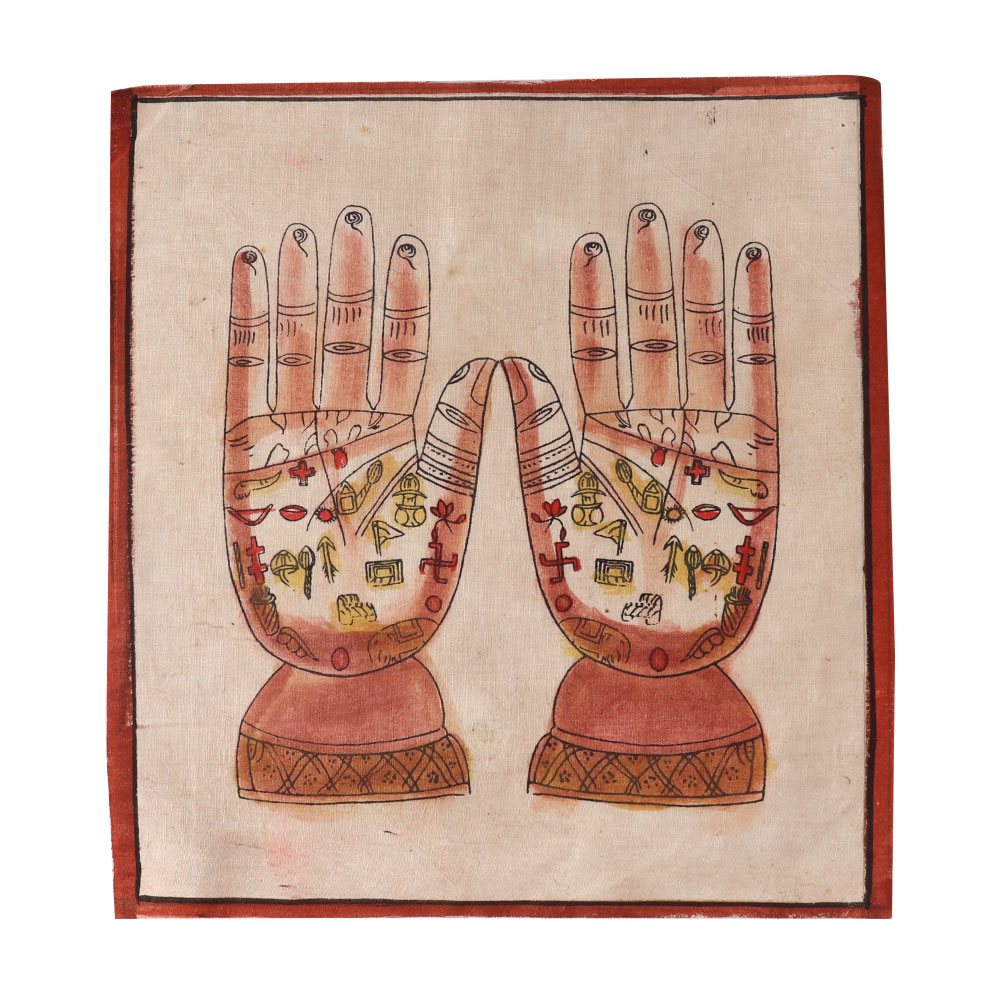 Experience the wonder of this magnificent Tantric painting from the western Indian state of Rajasthan. The painnting of Lord Vishnu hand is depicted in this artwork. Important items linked to scenes in his mythology are depicted in the picture.  In Hindu mythology, it is customary to depict Vishnu's handprints with items that have some connection to him. Your collection of Tantrik Hindu art will benefit from having this uncommon watercolour picture.