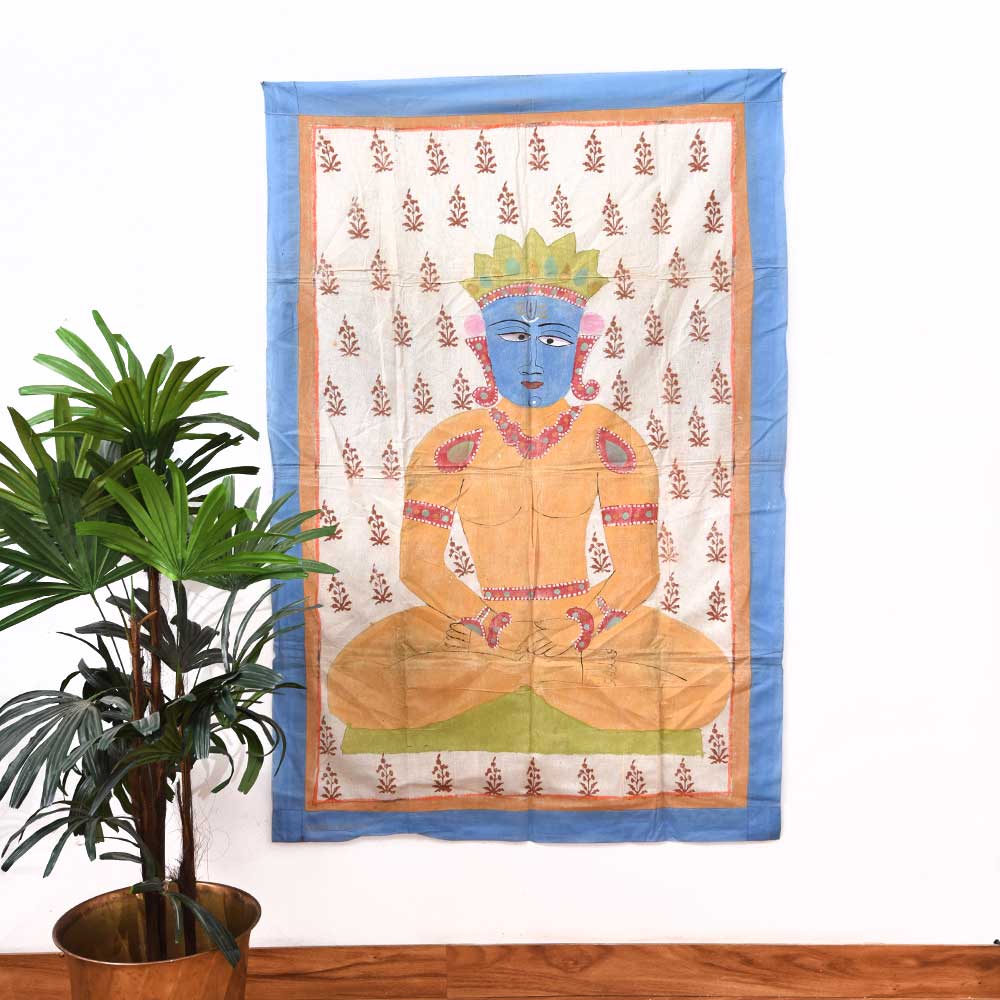 This cloth painting represents The Jain faith, an ancient Indian religion with a rich artistic and architectural past. Parsvanatha, one of Jainism's main deities, is portrayed in different types of art. On the other hand, an exceedingly uncommon miniature painting of a sitting figure of Parsvanatha is regarded as a notable masterpiece of Jain art. The picture is thought to be from the late 15th or early 16th century and is now in a private collection. It's painted on a rectangular piece of fabric. Parsvanatha is shown sitting, his legs crossed and his hands resting on his knees. He is dressed simply, with his hair twisted in a knot on his head. His face appears placid and pleasant, with closed eyelids and a faint grin on his lips. The intricacy and delicacy of its workmanship make this painting uncommon and expensive. The artist created delicate and realistic lines with a thin brush, bringing the figure of Parsvanatha to life. The painting's brilliant and rich colours contribute to its overall appeal. The handcrafted painting is a masterpiece of Jain art, and its scarcity increases its value among art collectors and lovers. The painting's significance stems from its depiction of Parsvanatha, considered one of Jainism's 24 Tirthankaras. Tirthankaras are enlightened beings who have achieved freedom from the cycle of birth and death. They are the focus of Jain devotion and are said to provide direction and protection to their devotees. The picture of Parsvanatha depicts this celestial person and serves as a reminder of the spiritual path that Jain believers strive to pursue.