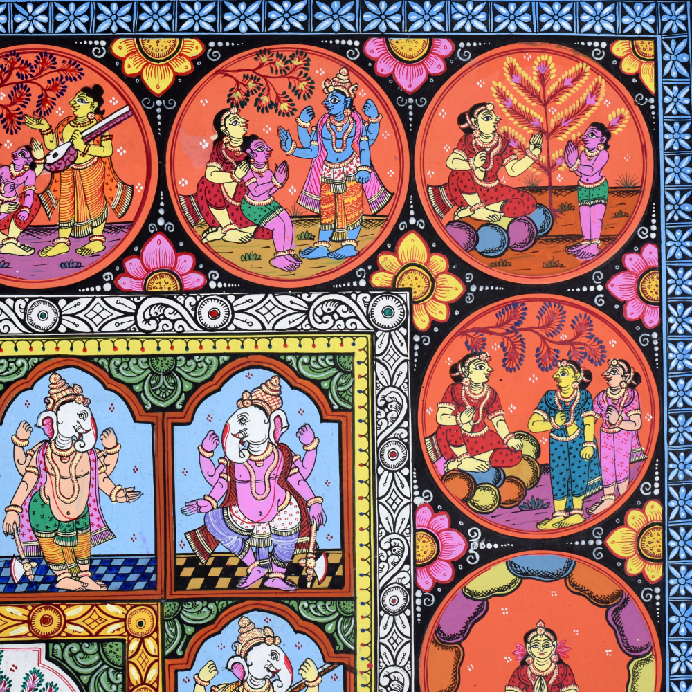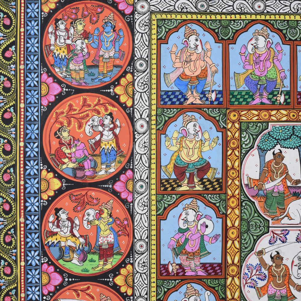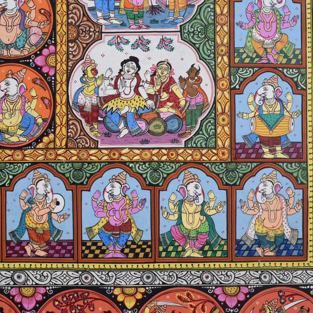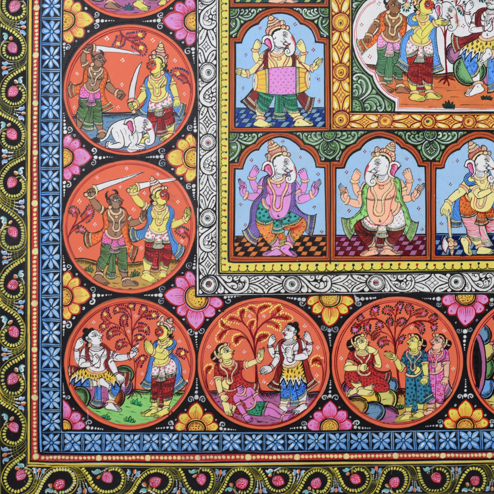 This beautiful Pattachitra painting on cloth paper beautifully showcases the life and various phases of Lord Ganesha, the beloved remover of obstacles and the god of wisdom and prosperity. The painting is highly detailed, vibrant, and tells a comprehensive story of Ganesha's origins, life events, and his role in Hindu mythology. Pattachitra art, native to Odisha, is known for its intricate line work, vibrant colors, and rich cultural depictions, which is clearly evident in this piece. At the center of the painting, Lord Ganesha is prominently featured, surrounded by multiple scenes that highlight the key events in his life. The central depiction shows Ganesha as the remover of obstacles, seated in his traditional posture, symbolizing his significance in both worldly and spiritual matters. His large elephant head, along with his human body, stands as a symbol of wisdom, compassion, and balance between the material and spiritual worlds. The surrounding panels depict different significant phases of Ganesha's life. One of the most well-known stories is his creation by Goddess Parvati, where she made him from clay to guard her while she bathed. Another famous episode shown is Lord Shiva, Ganesha's father, unknowingly beheading him in a fit of rage and later restoring his life by replacing his head with that of an elephant, symbolizing rebirth and divine intervention. The painting also illustrates Ganesha’s childhood, where he is often depicted with his mouse, his vehicle, which is an important aspect of his symbolism. In several panels, Lord Ganesha is shown in different postures and activities, including his victory over various demons, which showcases his divine power and wisdom. The detailed background and borders of the painting are filled with additional elements, such as smaller depictions of other deities, motifs, and floral patterns that add depth to the artwork. The use of rich colors such as red, blue, yellow, and gold brings life to each scene, ensuring that the viewer’s eye is drawn to every detail. In summary, this Pattachitra painting is a visual narrative of Lord Ganesha’s life, showcasing his significance in Hindu mythology. From his miraculous birth to his beheading and rebirth, and his eventual role as the remover of obstacles, this artwork encapsulates the divine qualities and wisdom associated with Ganesha. It serves as a reminder of the harmony between divine intervention, wisdom, and overcoming challenges, making it a valuable piece of spiritual and cultural art.
