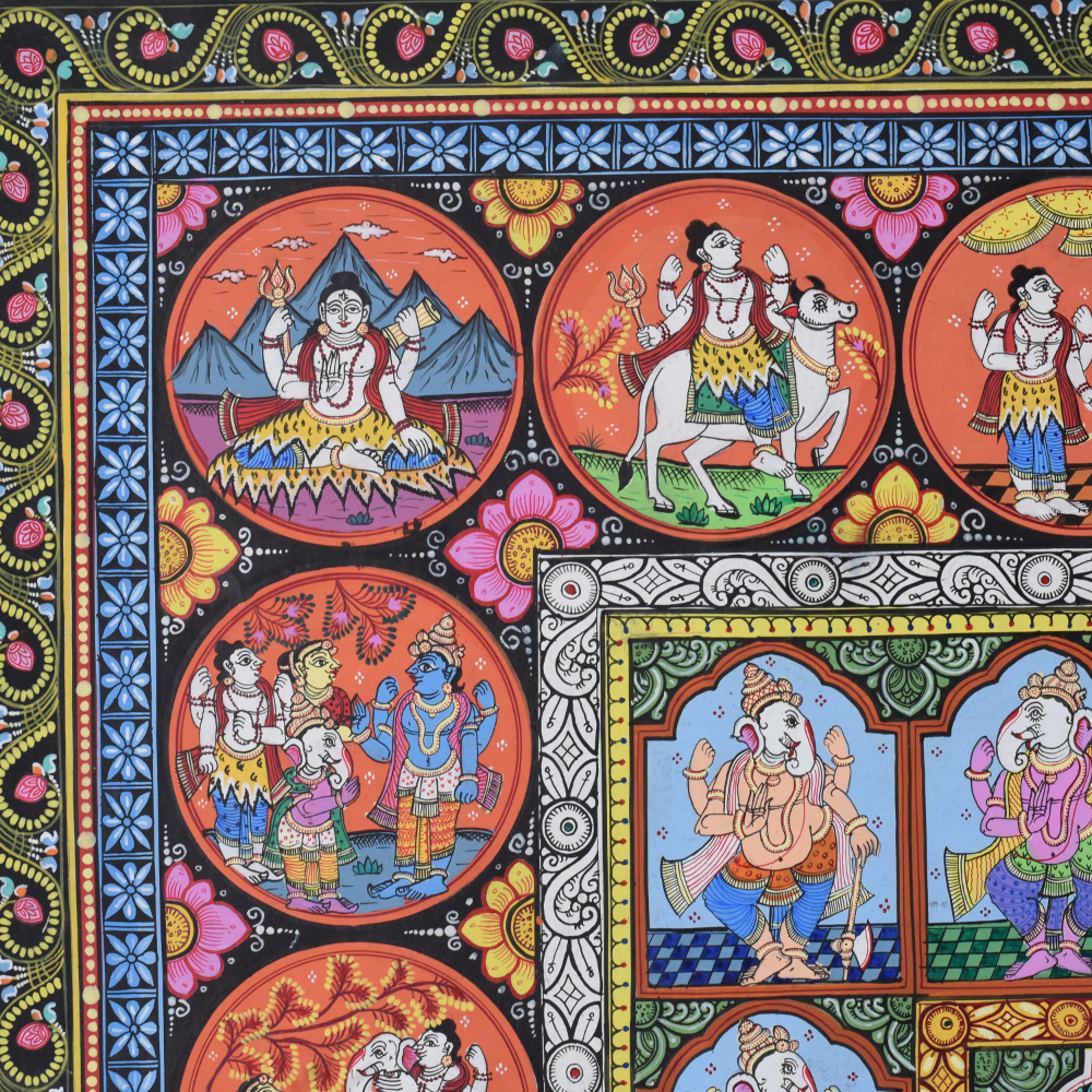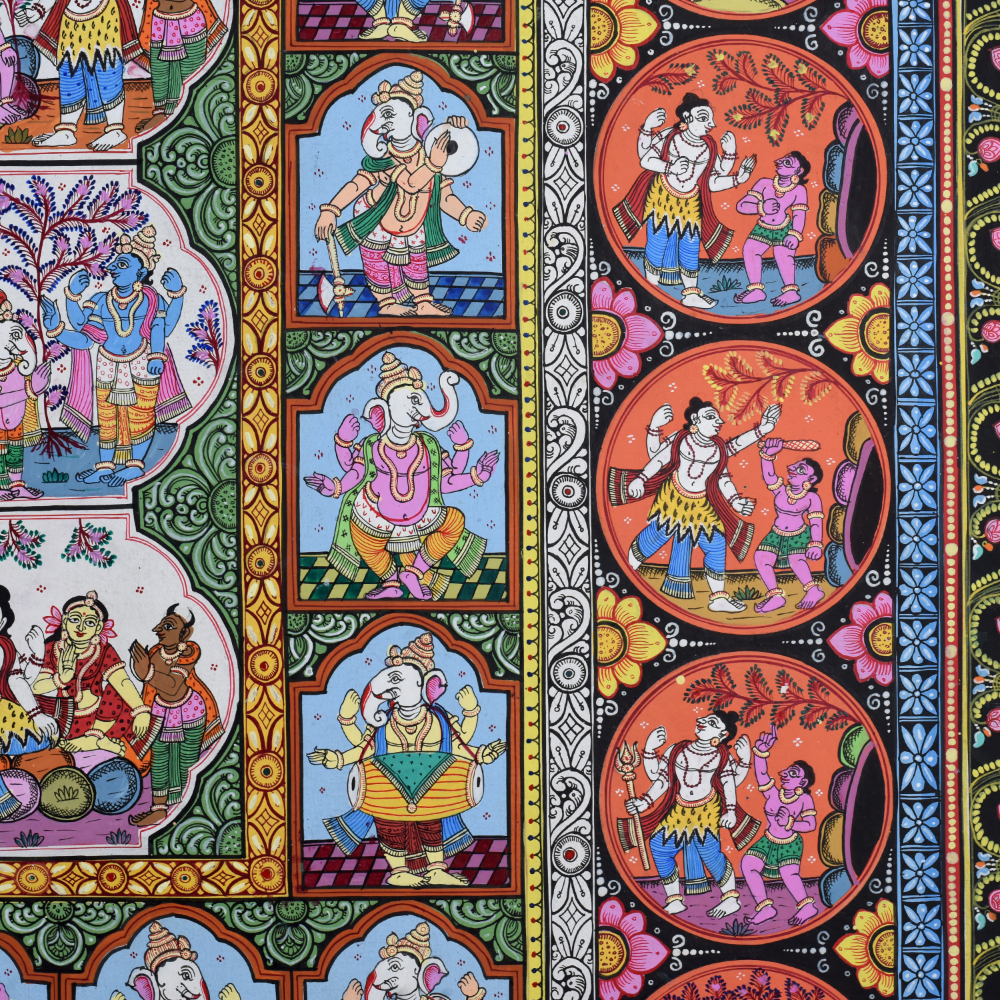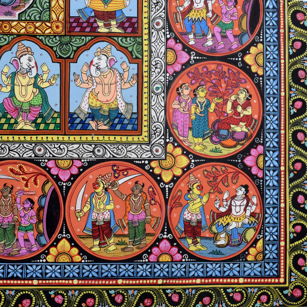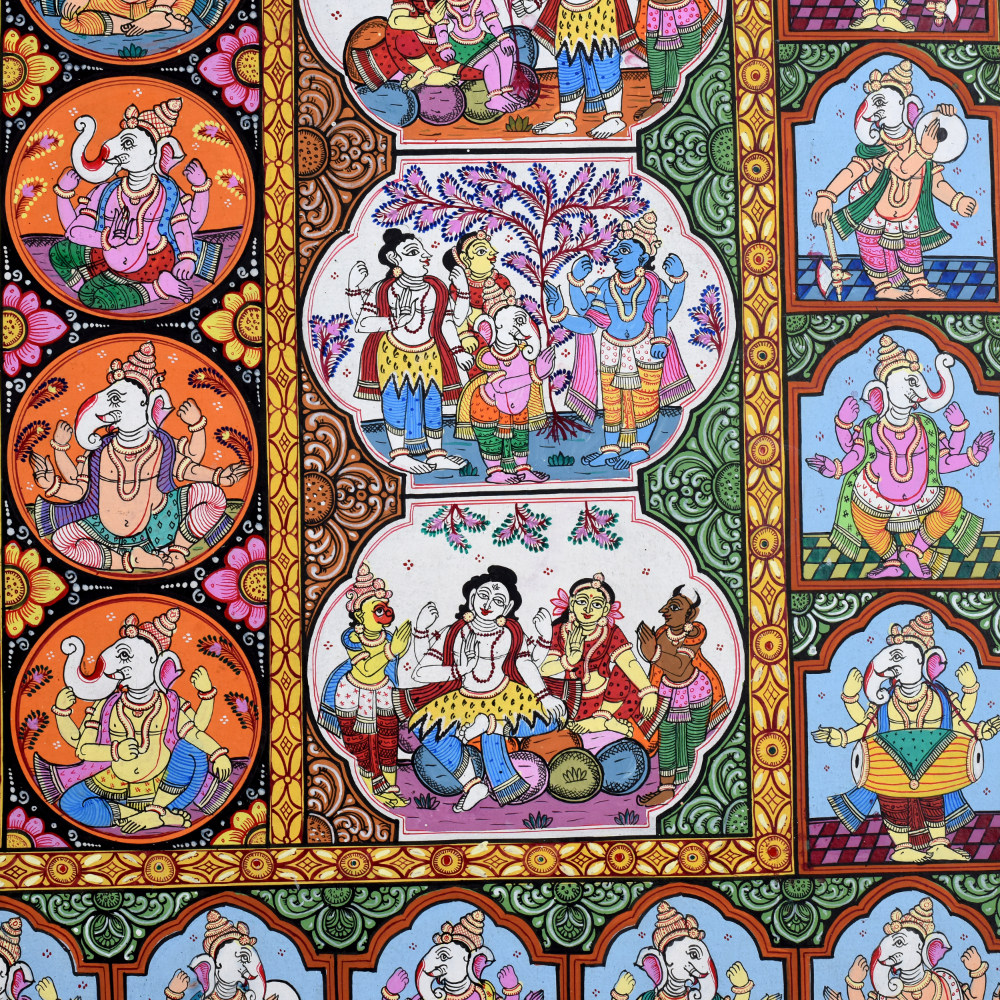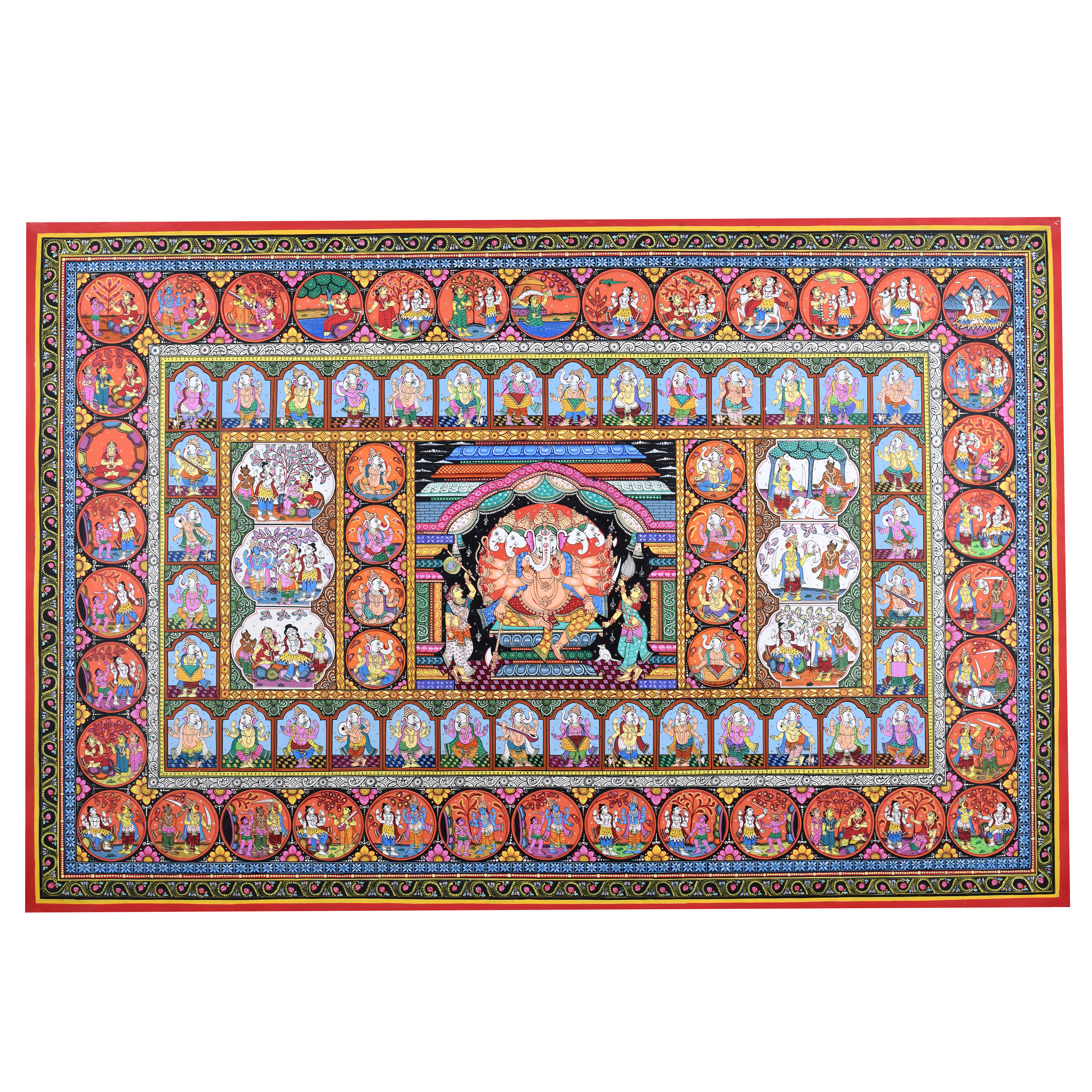 This beautiful Pattachitra painting on cloth paper beautifully showcases the life and various phases of Lord Ganesha, the beloved remover of obstacles and the god of wisdom and prosperity. The painting is highly detailed, vibrant, and tells a comprehensive story of Ganesha's origins, life events, and his role in Hindu mythology. Pattachitra art, native to Odisha, is known for its intricate line work, vibrant colors, and rich cultural depictions, which is clearly evident in this piece. At the center of the painting, Lord Ganesha is prominently featured, surrounded by multiple scenes that highlight the key events in his life. The central depiction shows Ganesha as the remover of obstacles, seated in his traditional posture, symbolizing his significance in both worldly and spiritual matters. His large elephant head, along with his human body, stands as a symbol of wisdom, compassion, and balance between the material and spiritual worlds. The surrounding panels depict different significant phases of Ganesha's life. One of the most well-known stories is his creation by Goddess Parvati, where she made him from clay to guard her while she bathed. Another famous episode shown is Lord Shiva, Ganesha's father, unknowingly beheading him in a fit of rage and later restoring his life by replacing his head with that of an elephant, symbolizing rebirth and divine intervention. The painting also illustrates Ganesha’s childhood, where he is often depicted with his mouse, his vehicle, which is an important aspect of his symbolism. In several panels, Lord Ganesha is shown in different postures and activities, including his victory over various demons, which showcases his divine power and wisdom. The detailed background and borders of the painting are filled with additional elements, such as smaller depictions of other deities, motifs, and floral patterns that add depth to the artwork. The use of rich colors such as red, blue, yellow, and gold brings life to each scene, ensuring that the viewer’s eye is drawn to every detail. In summary, this Pattachitra painting is a visual narrative of Lord Ganesha’s life, showcasing his significance in Hindu mythology. From his miraculous birth to his beheading and rebirth, and his eventual role as the remover of obstacles, this artwork encapsulates the divine qualities and wisdom associated with Ganesha. It serves as a reminder of the harmony between divine intervention, wisdom, and overcoming challenges, making it a valuable piece of spiritual and cultural art.