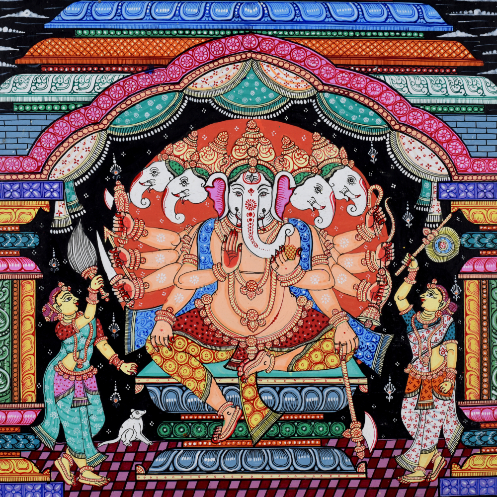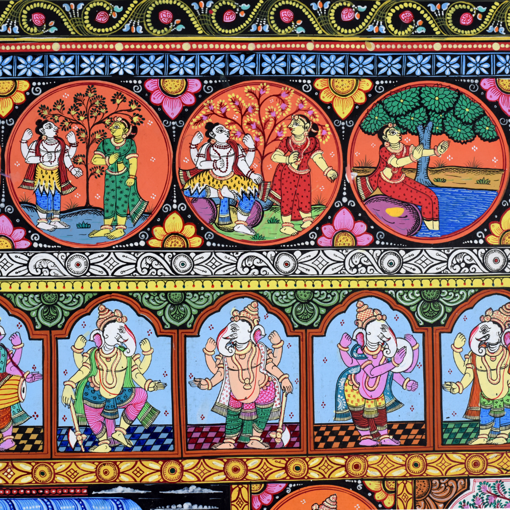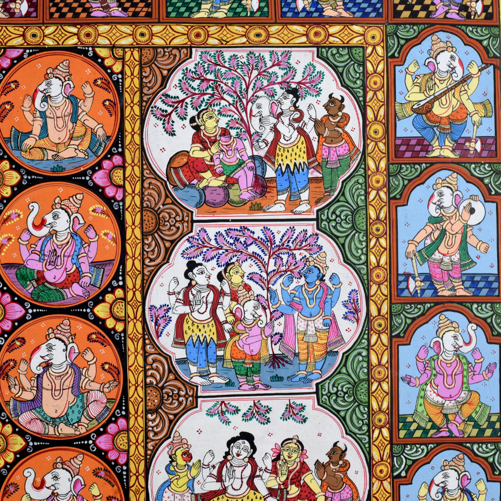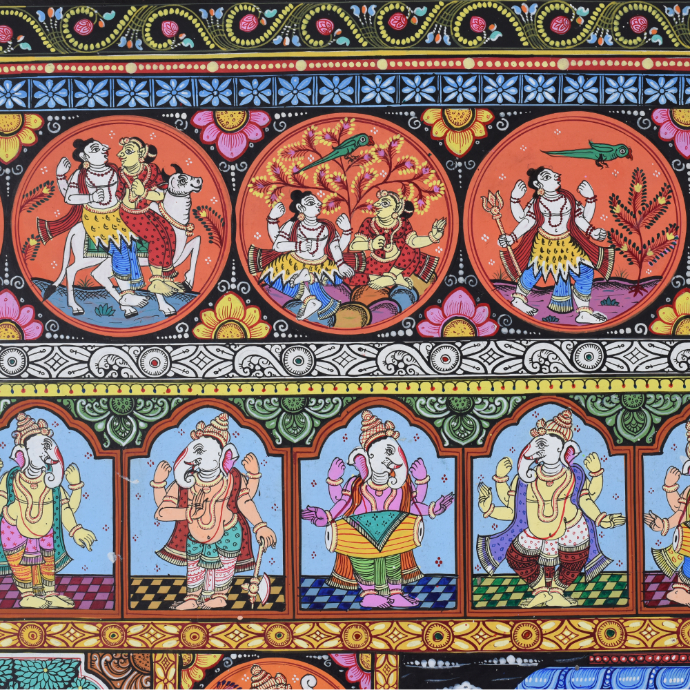 This beautiful Pattachitra painting on cloth paper beautifully showcases the life and various phases of Lord Ganesha, the beloved remover of obstacles and the god of wisdom and prosperity. The painting is highly detailed, vibrant, and tells a comprehensive story of Ganesha's origins, life events, and his role in Hindu mythology. Pattachitra art, native to Odisha, is known for its intricate line work, vibrant colors, and rich cultural depictions, which is clearly evident in this piece. At the center of the painting, Lord Ganesha is prominently featured, surrounded by multiple scenes that highlight the key events in his life. The central depiction shows Ganesha as the remover of obstacles, seated in his traditional posture, symbolizing his significance in both worldly and spiritual matters. His large elephant head, along with his human body, stands as a symbol of wisdom, compassion, and balance between the material and spiritual worlds. The surrounding panels depict different significant phases of Ganesha's life. One of the most well-known stories is his creation by Goddess Parvati, where she made him from clay to guard her while she bathed. Another famous episode shown is Lord Shiva, Ganesha's father, unknowingly beheading him in a fit of rage and later restoring his life by replacing his head with that of an elephant, symbolizing rebirth and divine intervention. The painting also illustrates Ganesha’s childhood, where he is often depicted with his mouse, his vehicle, which is an important aspect of his symbolism. In several panels, Lord Ganesha is shown in different postures and activities, including his victory over various demons, which showcases his divine power and wisdom. The detailed background and borders of the painting are filled with additional elements, such as smaller depictions of other deities, motifs, and floral patterns that add depth to the artwork. The use of rich colors such as red, blue, yellow, and gold brings life to each scene, ensuring that the viewer’s eye is drawn to every detail. In summary, this Pattachitra painting is a visual narrative of Lord Ganesha’s life, showcasing his significance in Hindu mythology. From his miraculous birth to his beheading and rebirth, and his eventual role as the remover of obstacles, this artwork encapsulates the divine qualities and wisdom associated with Ganesha. It serves as a reminder of the harmony between divine intervention, wisdom, and overcoming challenges, making it a valuable piece of spiritual and cultural art.