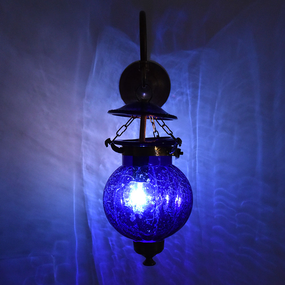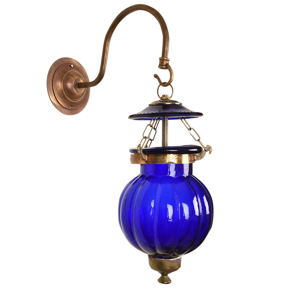 Cobalt blue melon shaped glass hanging lamp on bronze bracket. The lamp is unique and allows a great lighting option for any room.