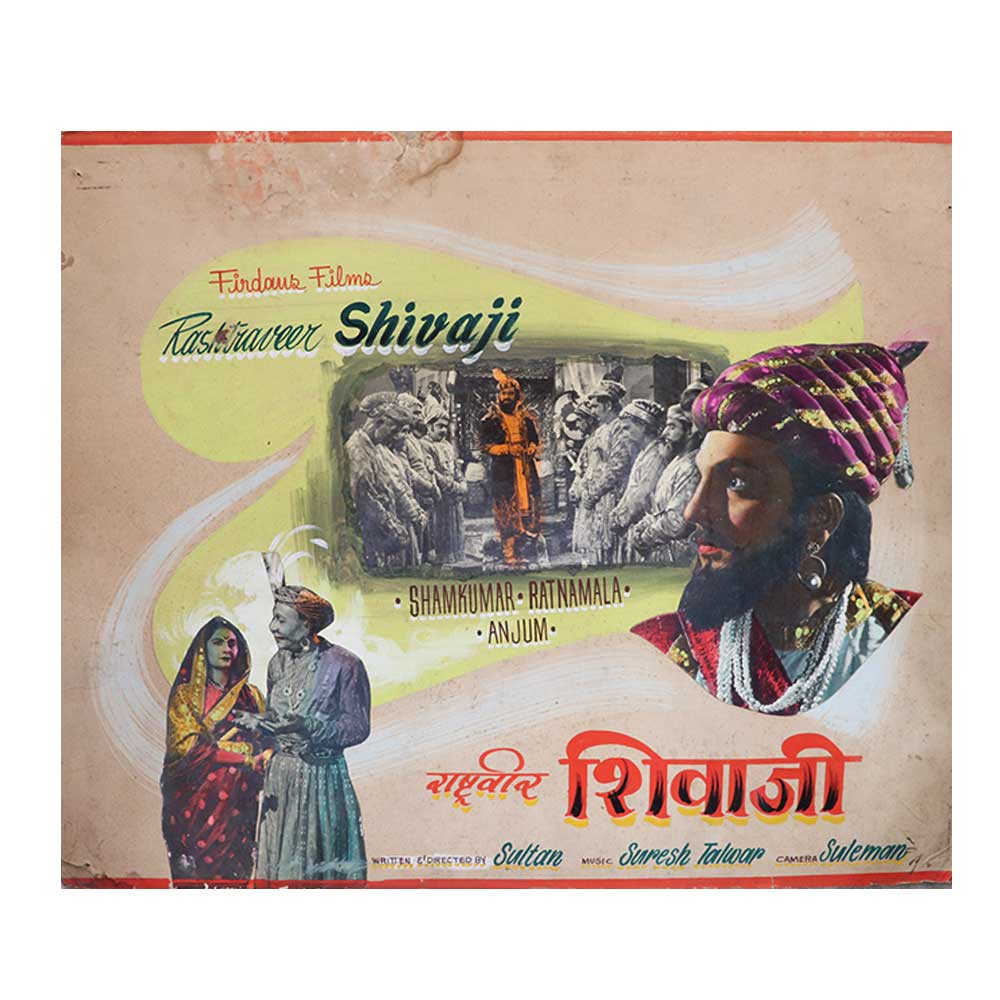 Old movie wall art poster of Rashtrapati Shivaji in technicolor color with Shivaji's mother and father, a courtroom scene and a close up of Shivaji himself. This can be used as a Wall Decoration for interiors of houses, hotels and restaurants, as a Diwali gift , wedding gift , House warming gift for your friends and family.