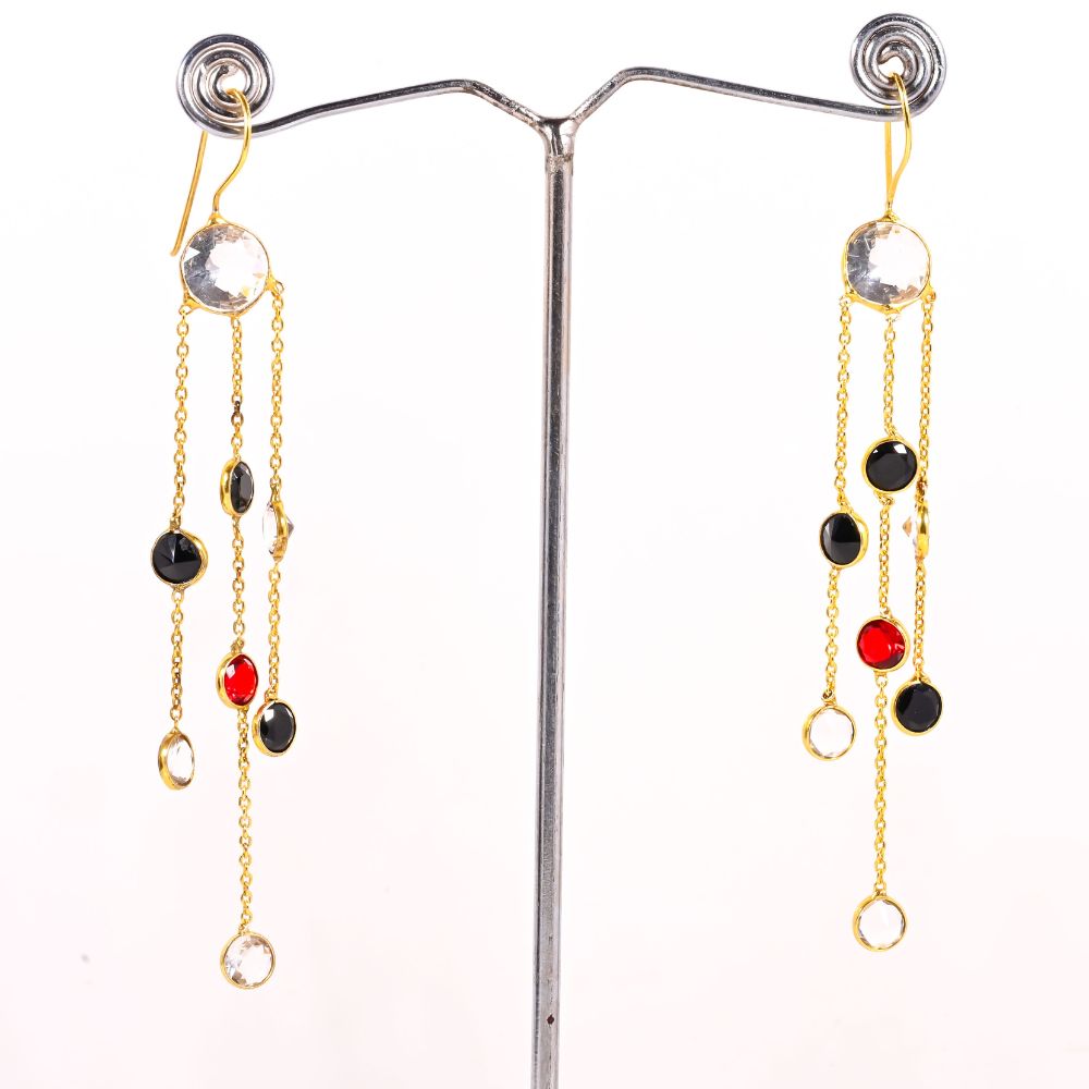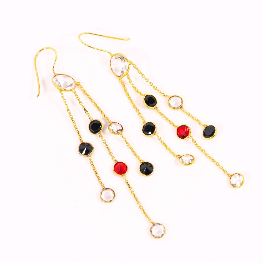 The Colorful CZ Stone Chain Dangle Earrings in Brass with 22K Gold Plating are designed to illuminate your look with movement and colour. Crafted in brass and finished with rich 22K gold plating, these earrings feature a cascade of colourful cubic zirconia stones that shimmer with every step. The chain-led silhouette adds graceful length without feeling heavy, creating a refined statement that feels celebratory yet polished. Perfect for modern occasions that call for expressive elegance.