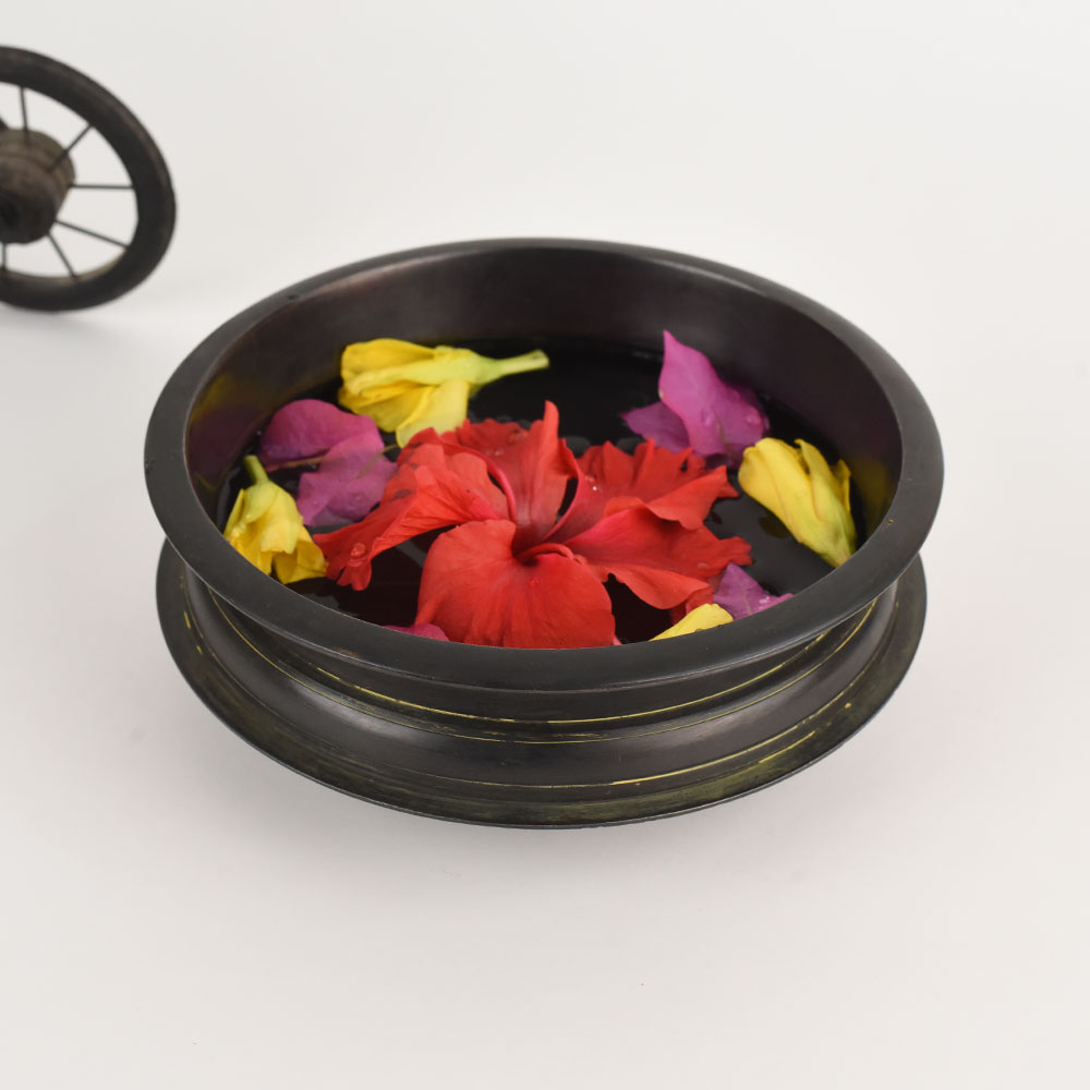 Celebrate the beauty of nature indoors with this handmade brass urli, ideal for creating cheerful floral arrangements. The gently curved sides cradle water and blossoms, while the subtle golden accents lend sophistication to your Decor. Whether used as a centerpiece at family gatherings or as an everyday decorative piece, it adds a fresh and inviting touch to any room. Crafted using traditional methods, the urli carries the marks of its maker, with slight variations in colour and texture that add character. The ample size means you can use it for potpourri, floating candles, or seasonal flowers. Its timeless appeal makes it a versatile accent that complements both contemporary and classic interiors.