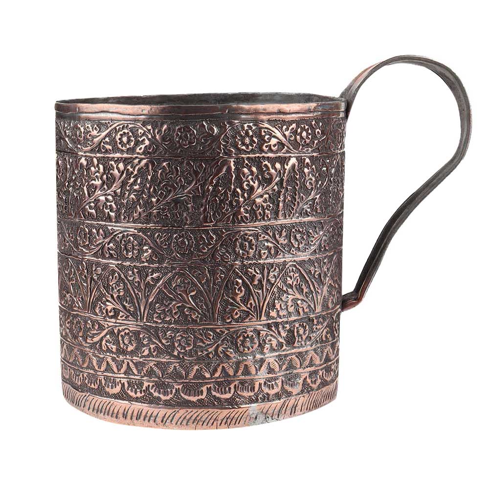 Intricately carved Copper Cup in a cylindrical form with heavy chiseled floral decoration in the form of border all over the surface of the cup . It has a long handle use it for yourself, as a table decoration kitchenware, as a gift for your friends and relatives on anniversary, Diwali, Christmas , anniversary, house warming etc.