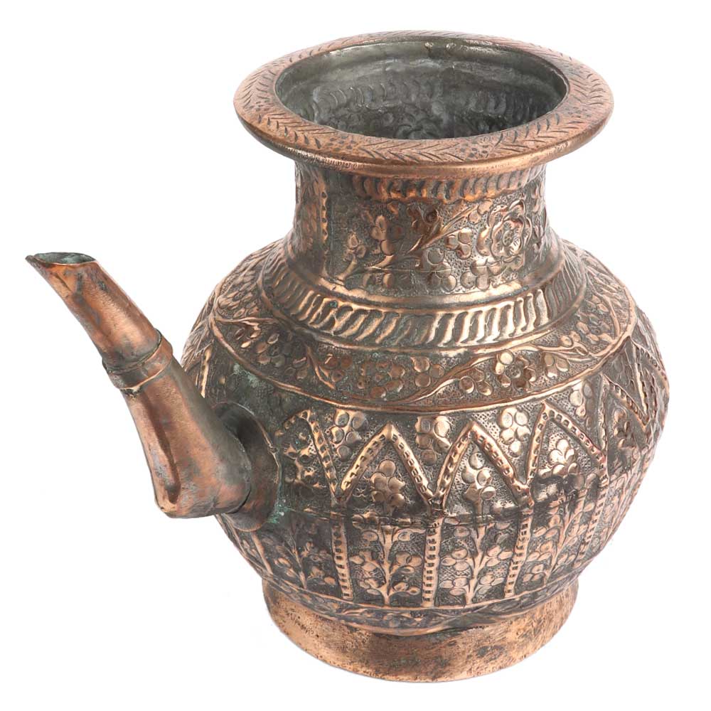 Copper Floral Engraved Islamic Style Holy Water pot the design covering almost every area of the pot including the stout, but excepting the foot. The design is similar to indo Persian design with lots of flowers and leaves . Wedding gift, Christmas gift and ideal collectors item.