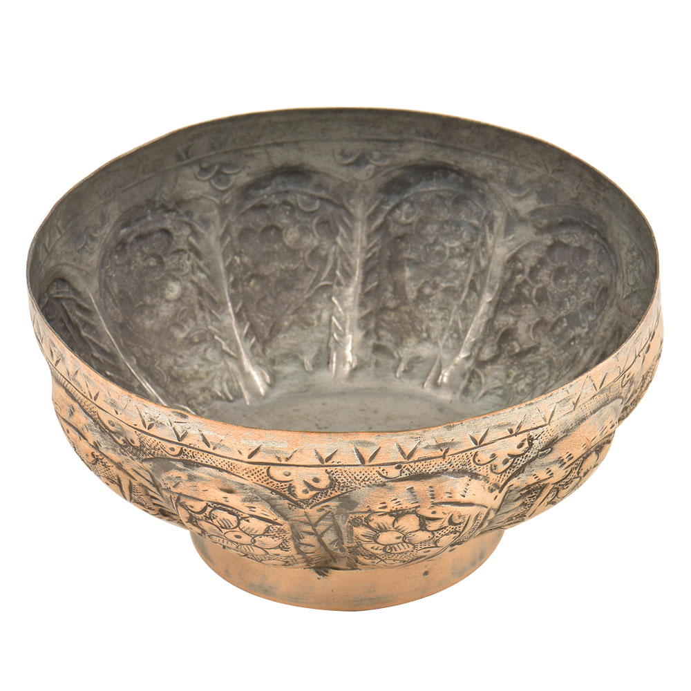 This piece is a beautiful vintage copper bowl made by the expert artisans and craftsmen of India. It's handmade and engraved with a flower pattern and leafy pattern all over the surface of the cup. It has a triangular pattern on the rim of the cup. The perfect addition to any set or your home kitchen decor.