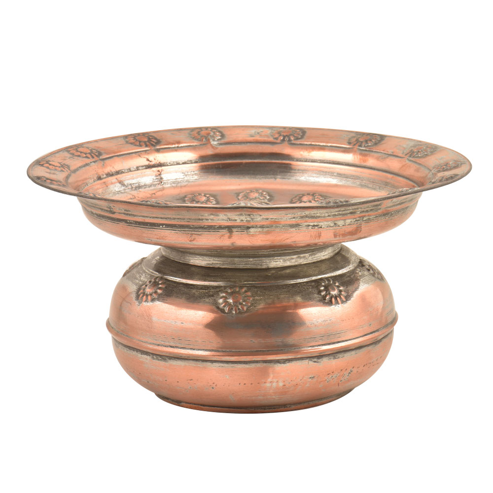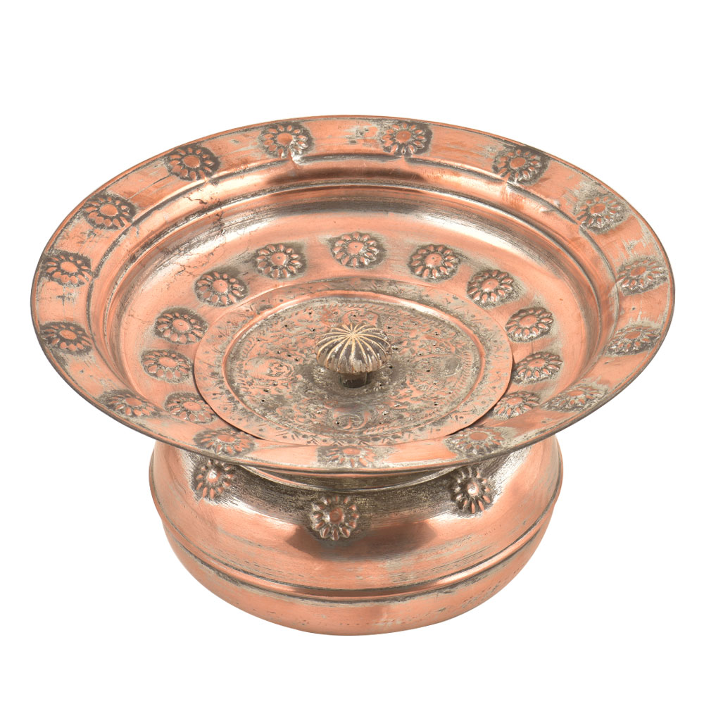Handmade Copper Ugal-Daa (Spittoon) is a receptacle made for spitting into, especially by users of chewing and dipping tobacco. It can also be used for decoration purposes or as a tray stand. It is fully decorated with repousse or embossed floral design on the entire Ugal daan.