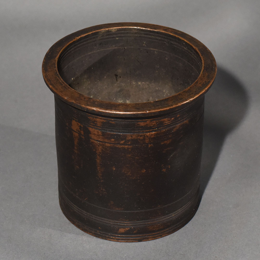 This copper Panchpatra holy water pot is an essential ritual vessel rooted in traditional Hindu worship practices. Commonly used during daily puja, temple ceremonies, and sacred offerings, the Panchpatra holds consecrated water that is sprinkled or offered while chanting mantras. Copper has long been regarded in Indian tradition as a purifying metal, believed to enhance the sanctity of water and support spiritual cleanliness. The pot features a sturdy cylindrical body with a slightly flared rim, designed for both balance and ease of use during rituals. Minimalist in form, it is accented with subtle horizontal rings near the top and base, lending it a restrained elegance. The surface bears a naturally aged patina, with rich brown and dark copper tones that reflect prolonged use and traditional hand-finishing techniques. These surface variations add depth and authenticity, making the piece feel rooted in ritual history rather than purely decorative. Functionally, the Panchpatra is often paired with a copper or brass spoon (uddharani) and placed beside the kalash or deity during worship. It is suitable for holding holy water, gangajal, or sanctified liquids used in purification rites and offerings. Beyond its religious purpose, this vessel also serves as a refined example of Indian ritual metalware, appealing to collectors and those who appreciate sacred objects with cultural meaning. Whether used daily in a home shrine or displayed as part of a spiritual decor arrangement, this copper Panchpatra embodies simplicity, reverence, and timeless tradition. Over time, its evolving patina enhances both its visual and symbolic value.