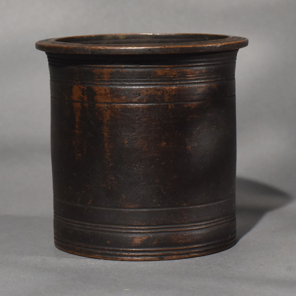- Simple cylindrical form with flared rim and banded detailing