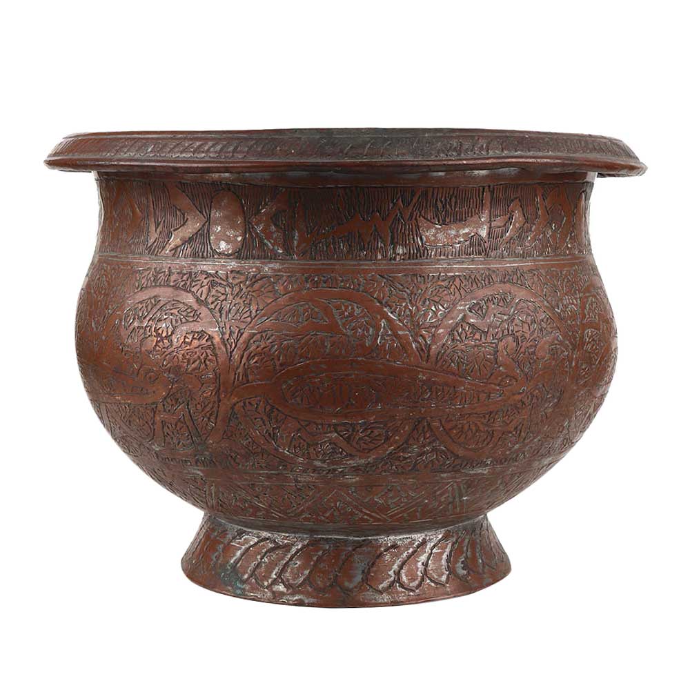 Hand engraved copper planter pot with leaves and floral design in tribal style with a wide mouth and rope design pattern on the rim and a round bulbous body with a carved round base for support and balance. Use it as a flower pot, display your plants . Use it as a showpiece for your living room, reception area, lobby of your house, hotels, airports or restaurants. Gift it to your near and dear ones.