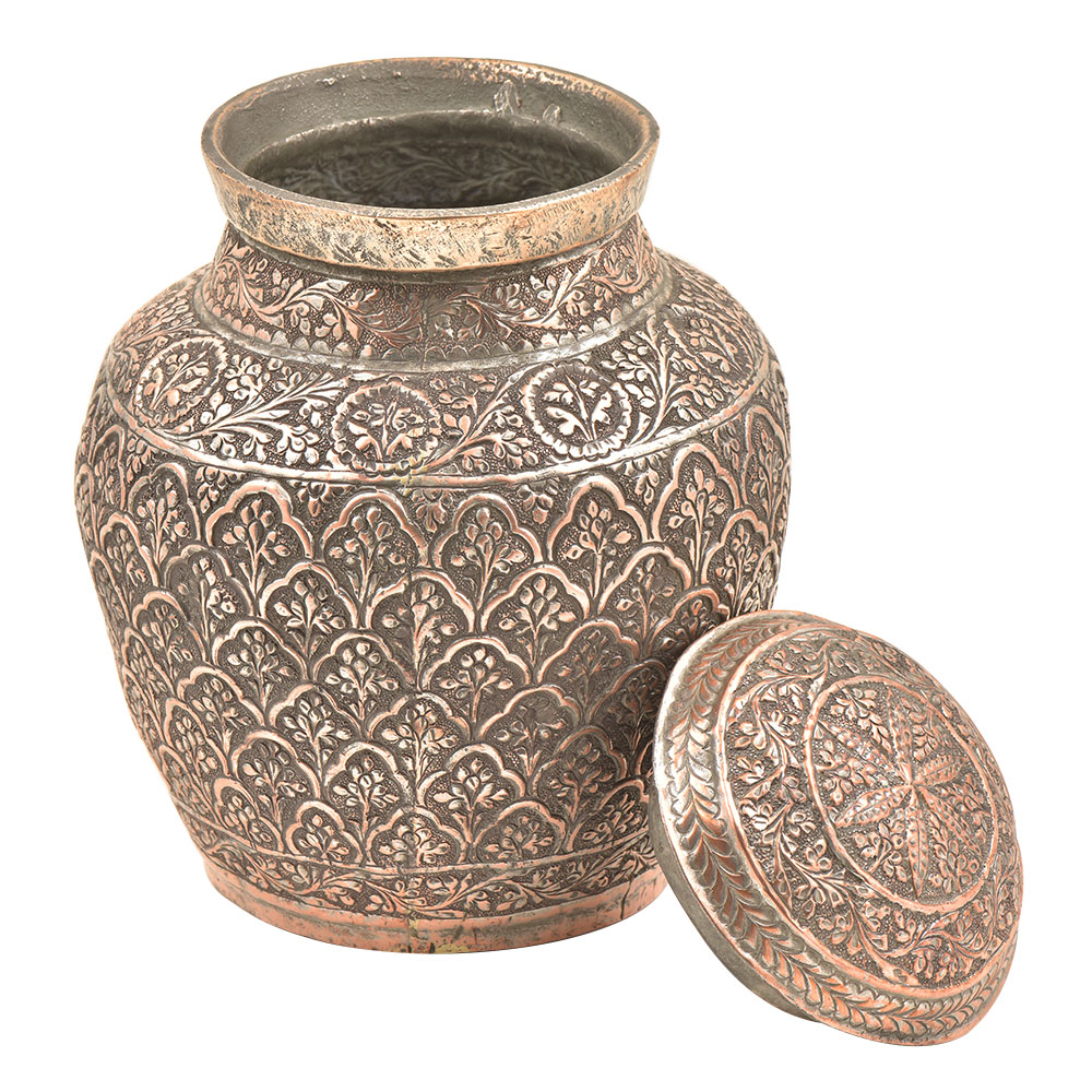 Handmade artisan copper lidded box or jar. This storage jar is covered with hand repousse design with copper metal knob for lid handle. This container is etched with detailed floral and leaf designs in perfect mughal style. This copper jar is such a cute addition to your decor, or to use for cotton balls, wrapped candies, or whatever else your heart desires.