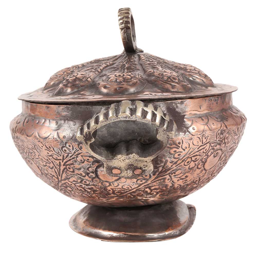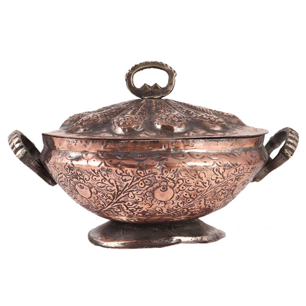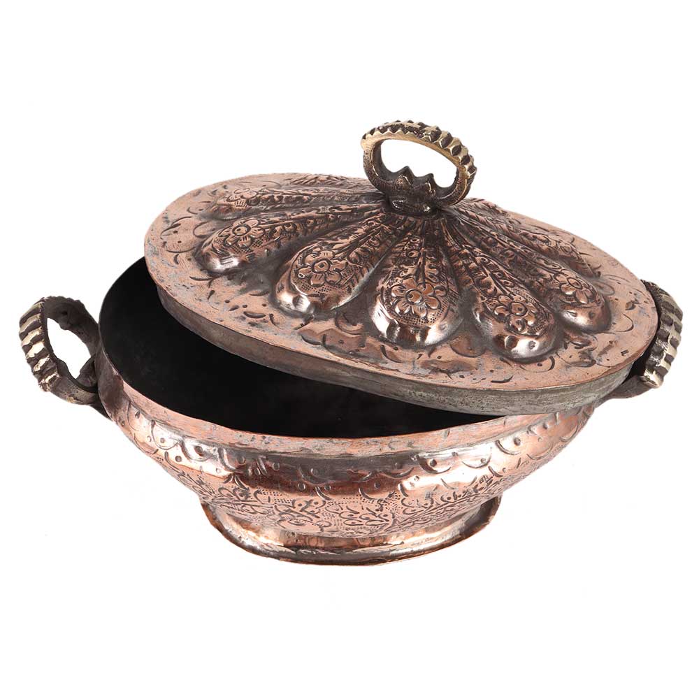 The classic chinar wines are beautifully engraved on the Kashmiri Copper Rice Bowl With Lid And Handles. This handcrafted Kashmiri Copperware is a symbol of royalty made by India's expert craftsmen. Gift it to your friends and family.