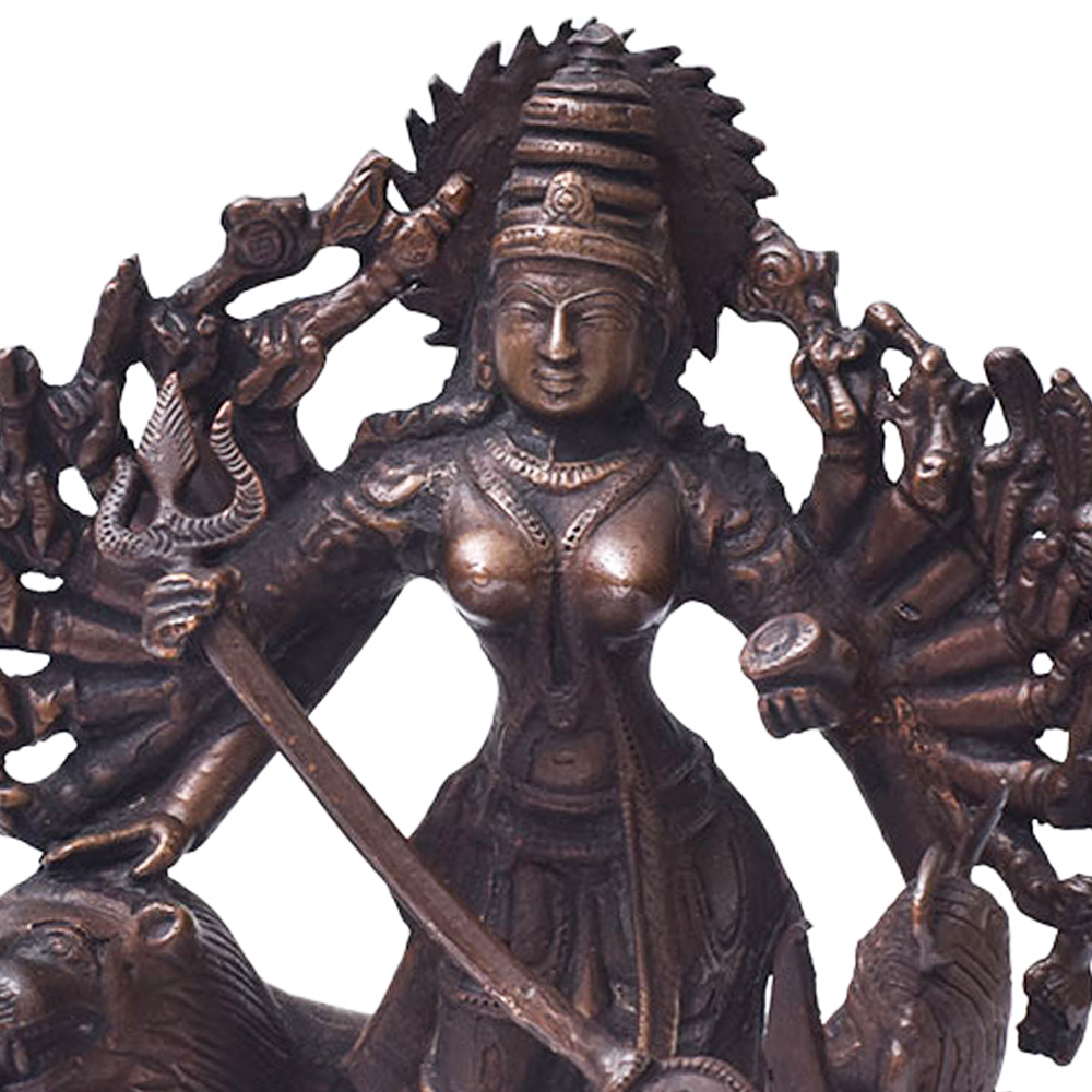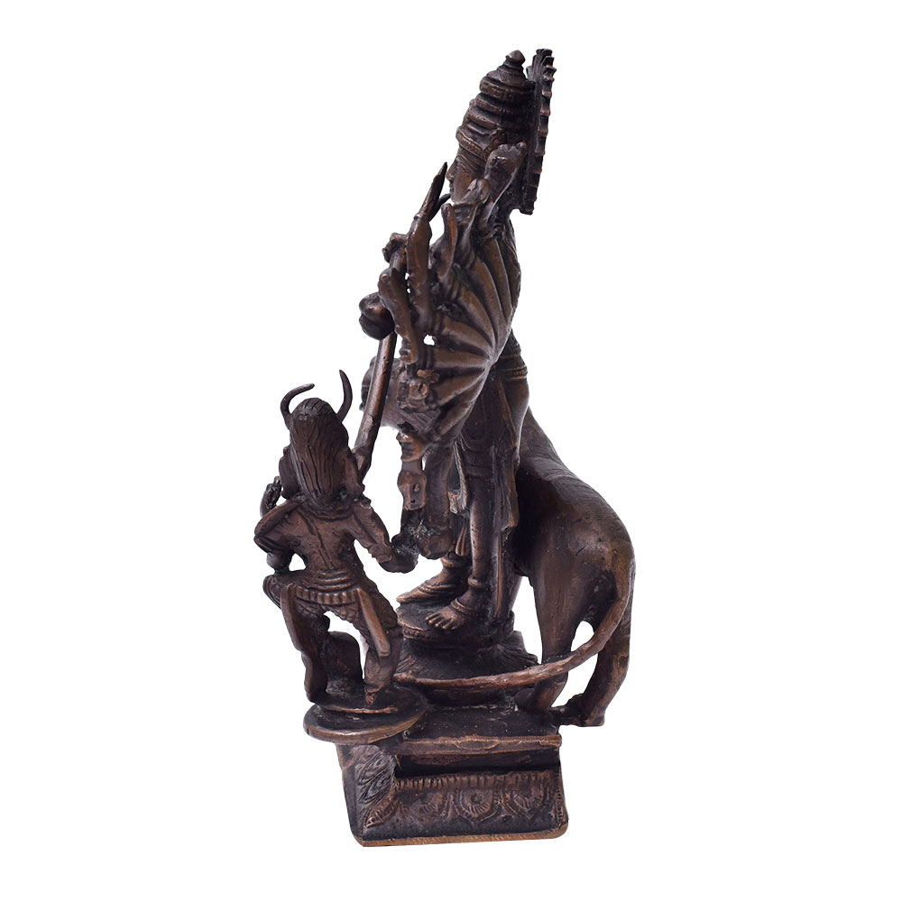 The copper statue of Goddess Durga killing Mahishasur is a stunning depiction of the Hindu goddess amid a mighty battle. The figure portrays Durga as a fierce warrior goddess, slaying the demon Mahishasur with her many weapons and powerful stance. The statue is made of high-quality copper and stands tall. The intricate details of the statue are meticulously crafted, with each element of Durga's outfit and weapons carefully designed to reflect her strength and power. Her many arms are shown holding various weapons, including a sword, a trident, and a bow and arrow, all directed towards the defeated demon at her feet. One of the most striking elements of the statue is Durga's expression. She is shown with a fierce and determined look, reflecting her strength and determination in battle. Her pose is also powerful and commanding, with her weapon on the demon's chest symbolizing her victory over evil. The statue is also highly symbolic, with each element of Durga's appearance representing different aspects of her character and story. For example, her many arms symbolize her ability to accomplish many things simultaneously, while her weapons symbolize her power and determination in battle. Durga is one of the most important deities in Hinduism and is often seen as a protector of the universe and of her followers. She is revered for her strength, courage, and determination, symbolizing female empowerment and resilience. This copper statue in a dark finish captures all of these elements beautifully and powerfully, making it a perfect addition to any collection or shrine. Overall, the copper statue of Goddess Durga killing Mahishasur is a stunning representation of one of the most influential figures in Hindu mythology. It is a powerful and inspiring symbol of strength, courage, and determination and will inspire and awe all who see it.
