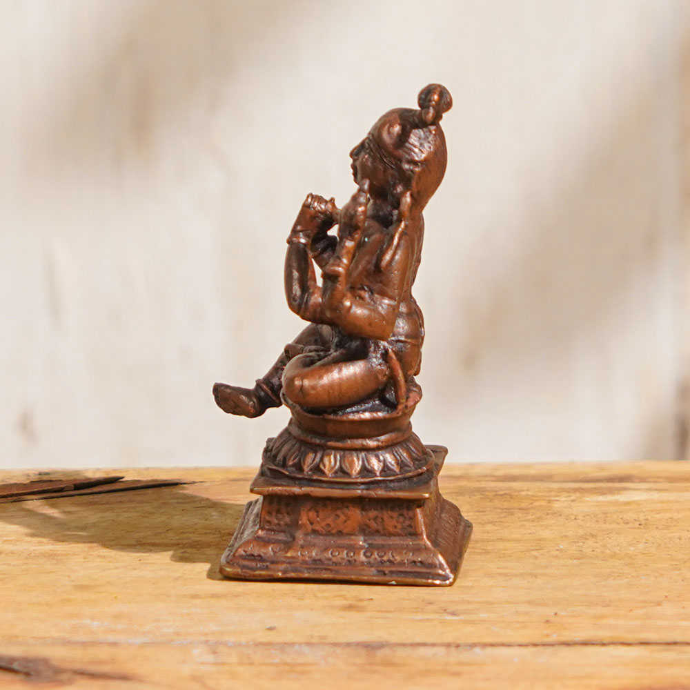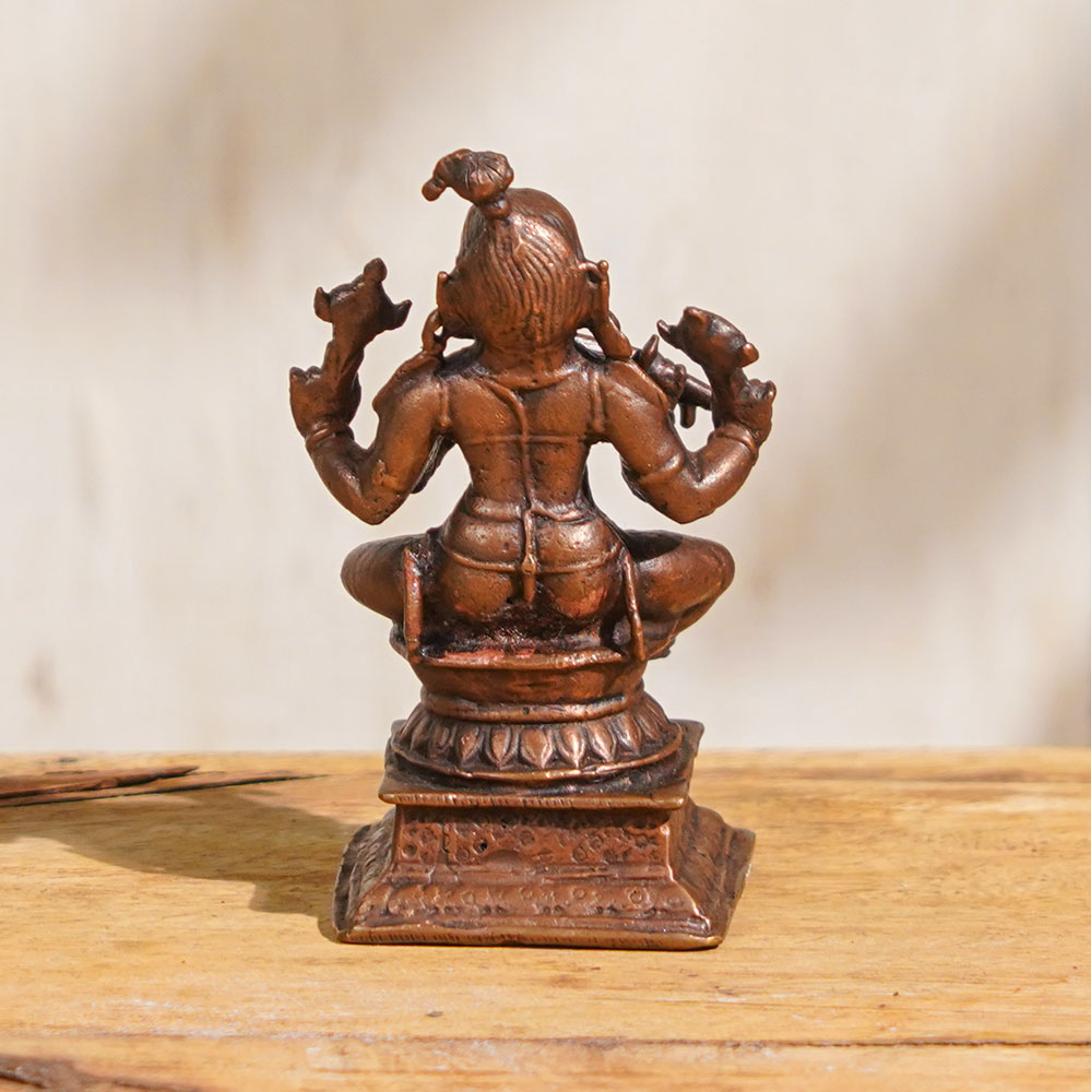 A copper statue of Lord Krishna playing flute which is one of his key defining features. In this intricately carved statue it is how Kanha is sitting on a lotus platform with his legs crossed and with a murli in his hands.