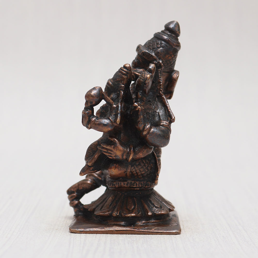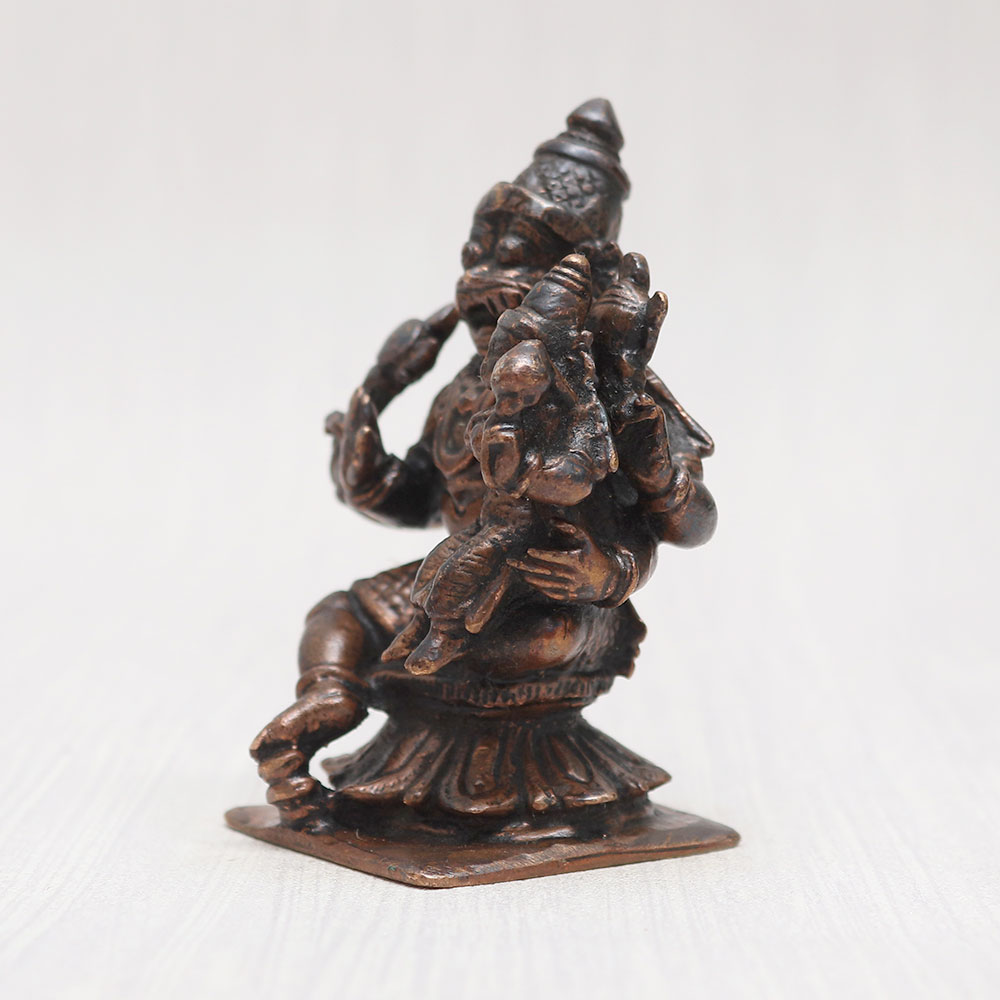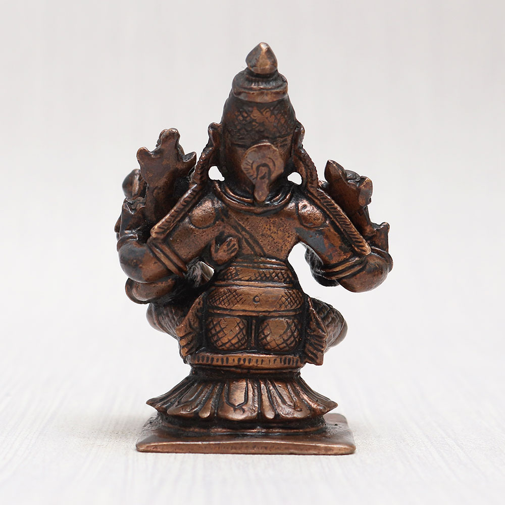 A stunning copper god sculpture of Lord Narasimha, skillfully handmade by highly talented artisans from India. This masterpiece features Lord Narasimha seated on a divine platform, with the graceful presence of Goddess Lakshmi seated on his left lap. Crafted from high-quality copper with a vintage-style finish, this god idol is perfect for your prayer room at home, office, restaurant, cafe, or shop. The statue's captivating eye-catching detailing makes it an ideal item for exhibition, decoration, and collection. Moreover, it is a splendid addition to any temple for worship. Whether for personal devotion or gifting family, friends or relatives on special, festive, or auspicious occasions, this idol is sure to bring blessings and divine energy into your life.