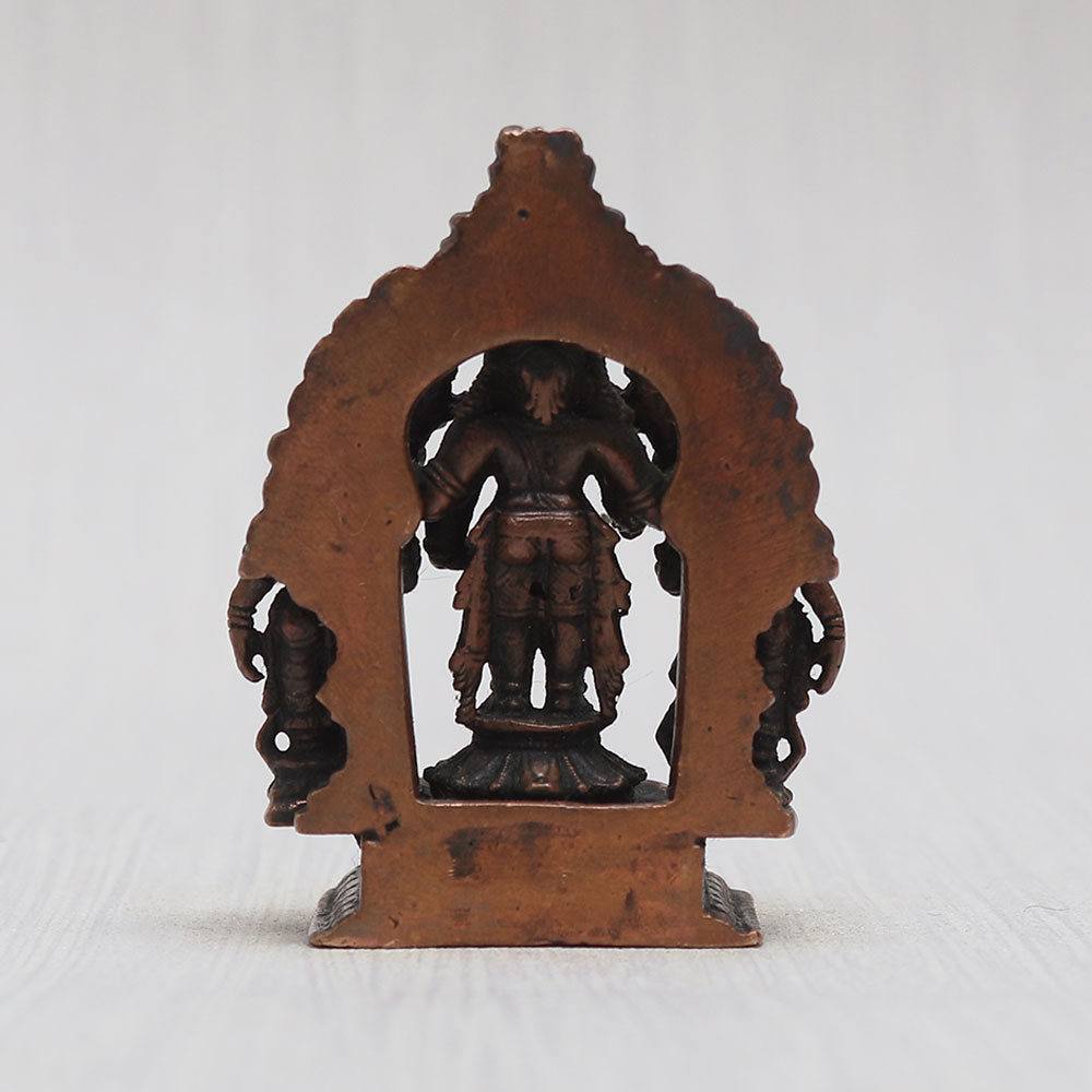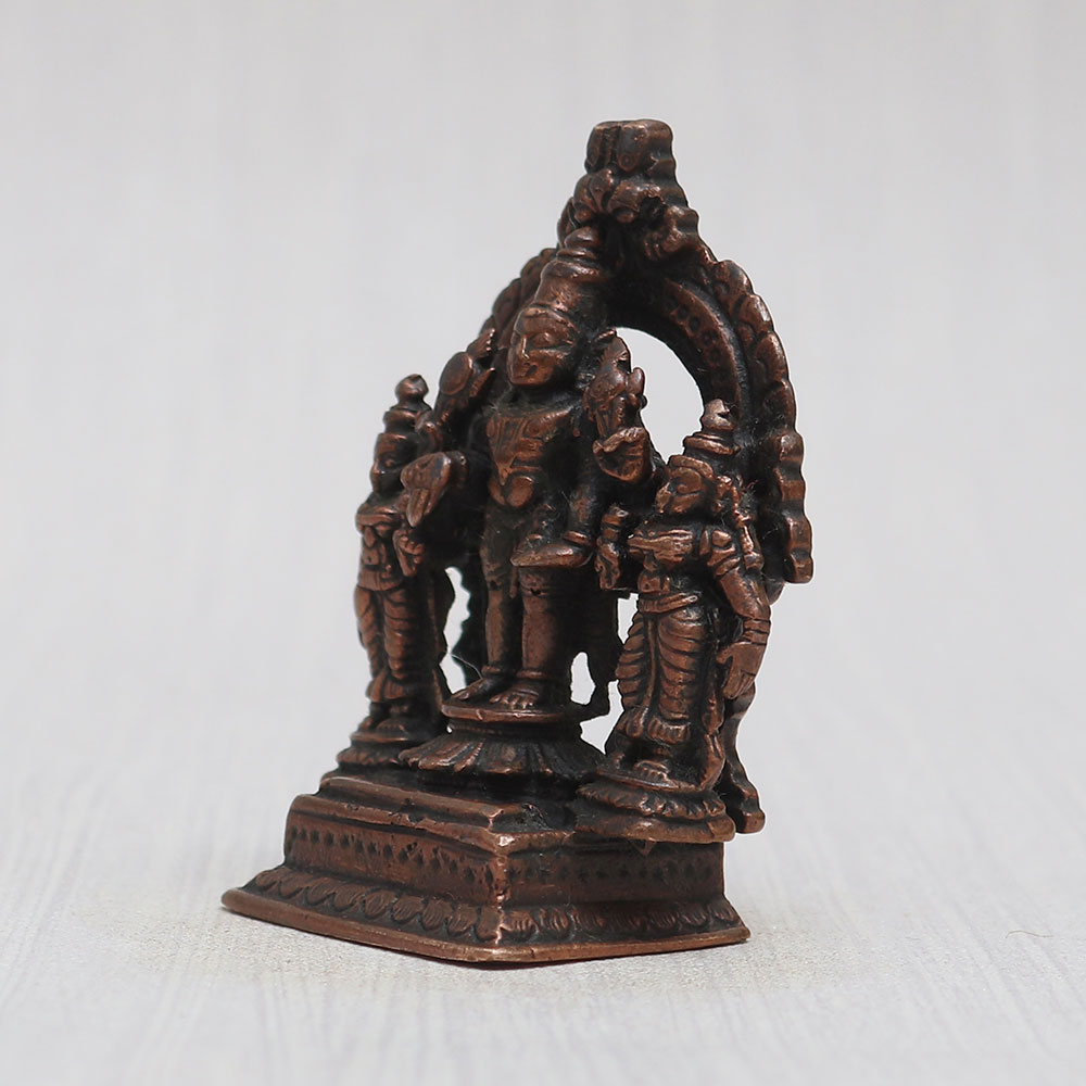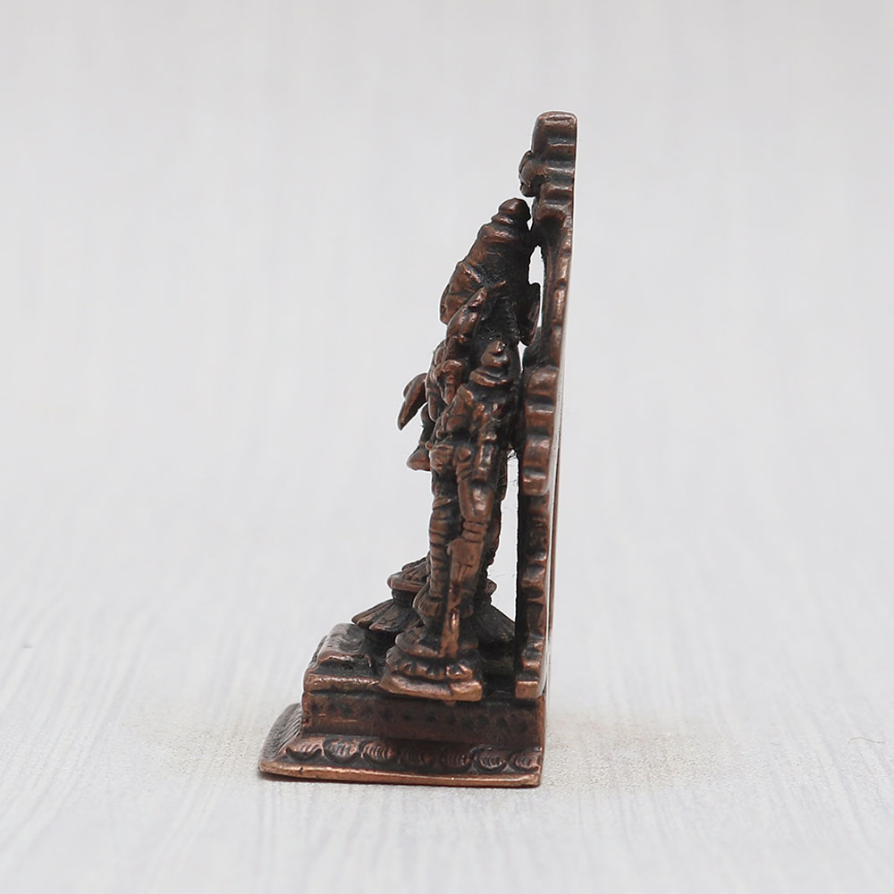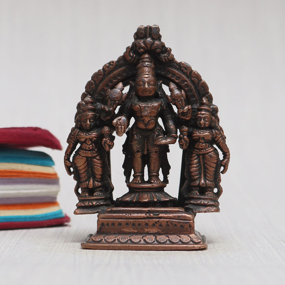 A copper statue of Lord Perumal gracefully standing on a platform alongside his consorts, Sridevi and Bhudevi. Handcrafted with unparalleled skill by Indian artisans, this god sculpture exudes an aura of spirituality and elegance. Meticulously crafted from high-quality copper, it boasts a vintage-style finish that adds to its charm. With its captivating detailing, this murti becomes the centerpiece of any prayer room at your home, office, restaurant, cafe, or shop. Its versatile appeal makes it an ideal item for exhibition, decoration, or collection. Place it in a temple for worship, and experience a heightened sense of devotion. What's more, it makes for a thoughtful gift for your loved ones on special, festive, or auspicious occasions, spreading the blessings of Lord Perumal to all.