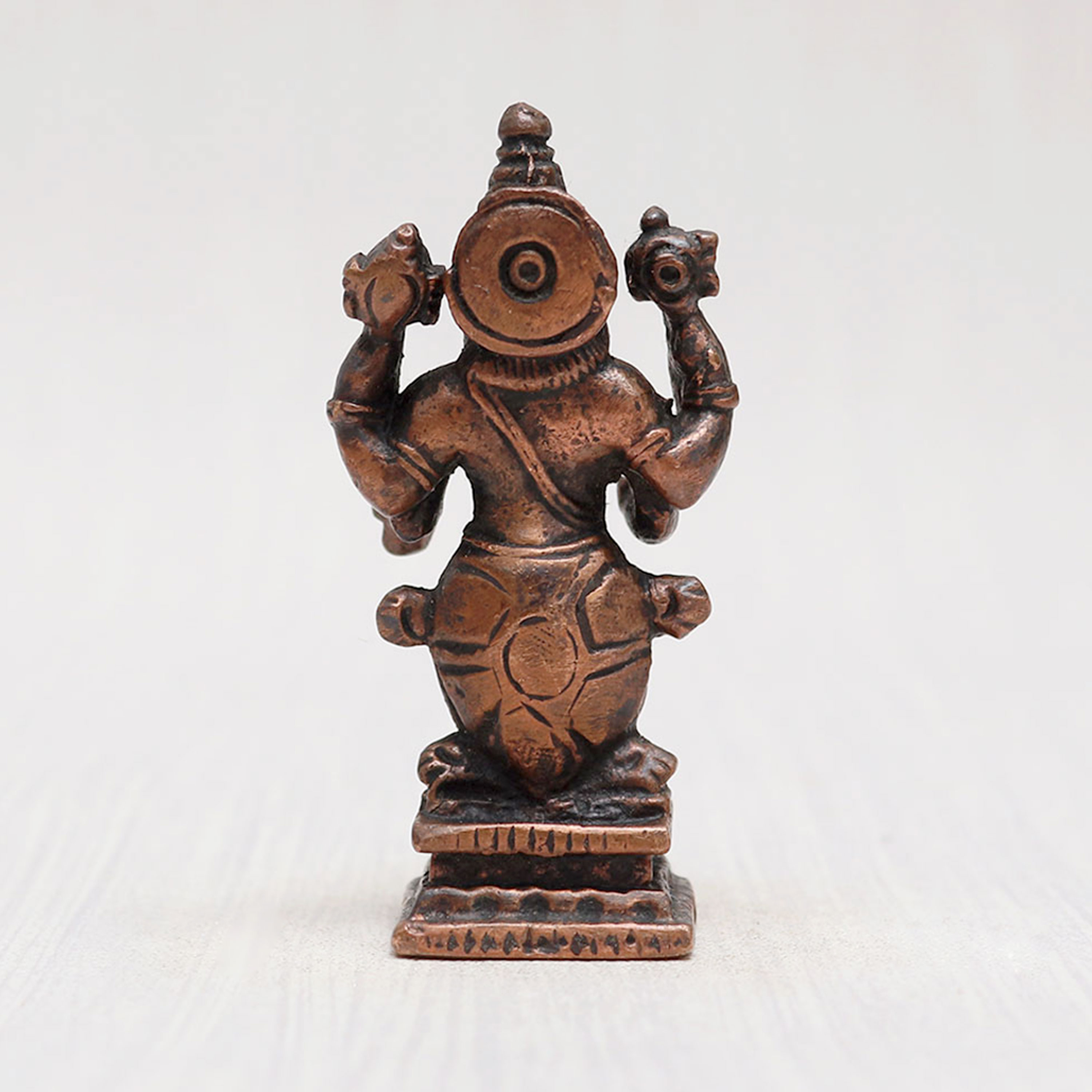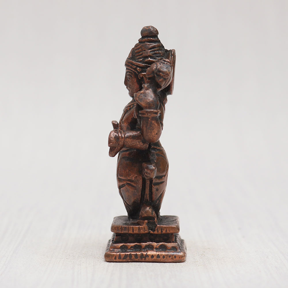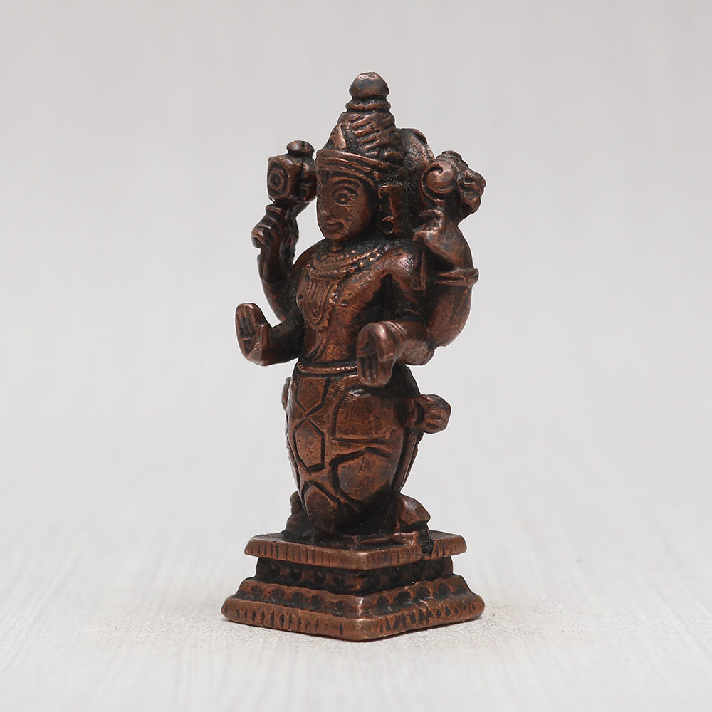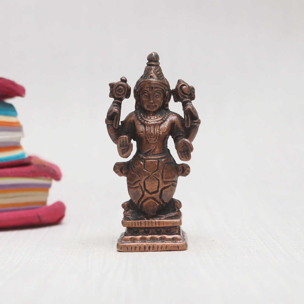 A divine Matsya copper statue meticulously handcrafted by highly skilled and experienced Indian artisans. This enchanting depiction of Lord Vishnu's avatar stands gracefully on a platform, emanating an aura of spiritual tranquillity. Crafted from high-quality copper with a vintage-style finish, this statue is a captivating addition to your prayer room at home, office, restaurant, cafe, or shop. With its remarkable eye-catching detailing, this Indian god statue is a perfect item for exhibitions, decorations, and collections. Its divine essence also makes it an ideal addition to any temple for worship. Celebrate special occasions by gifting this magnificent Matsya deity to your loved ones, spreading blessings and positive energy on festive and auspicious days. Discover the elegance and grace of traditional Indian god sculptures and murtis online.