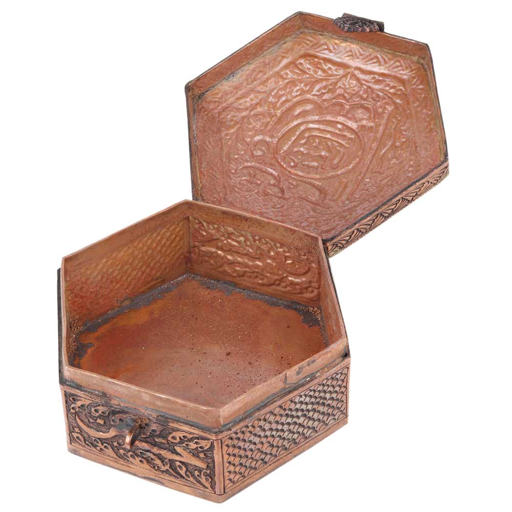 This lovely box appears to be made of copper. It has a beautiful embossed pattern on the entire surface of the box .It has a hinged lid and a latched closure. Store your valuables, jewelery and important documents in this box. It is an ideal gifting option for friends and relatives.