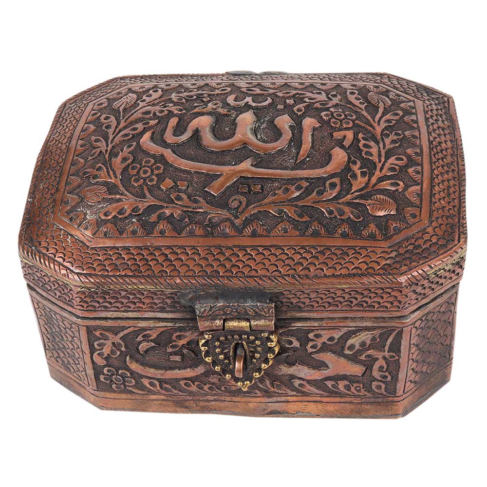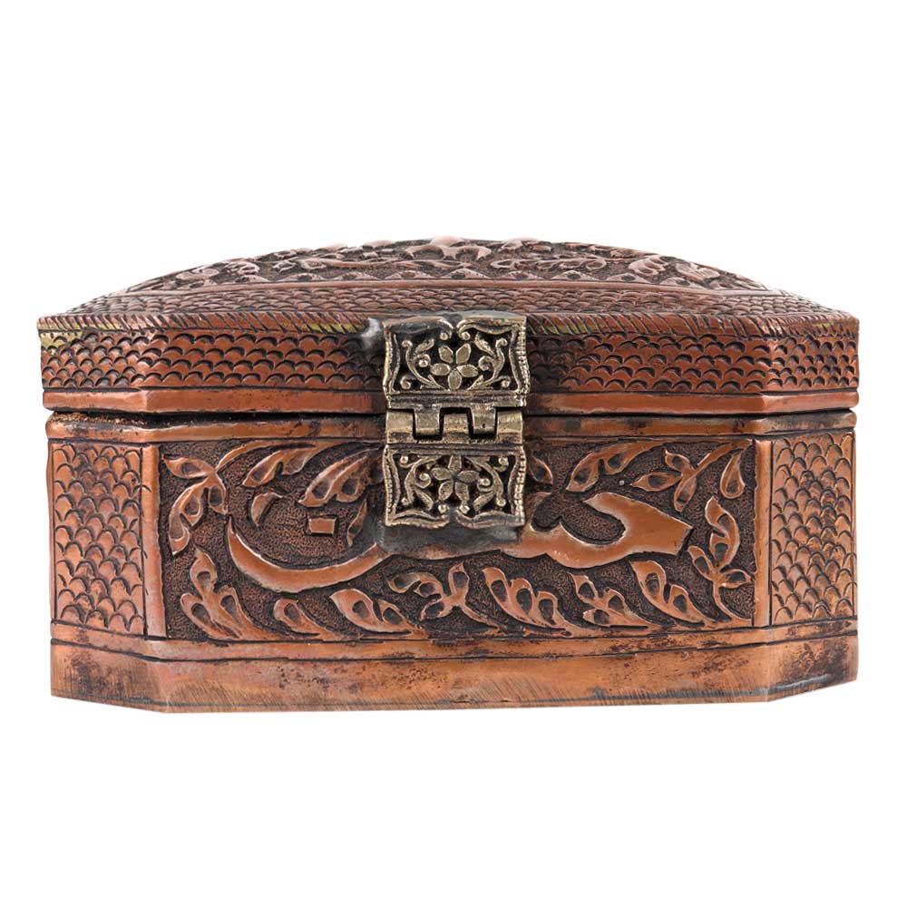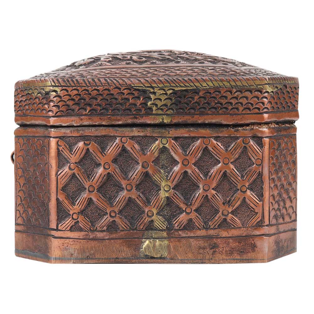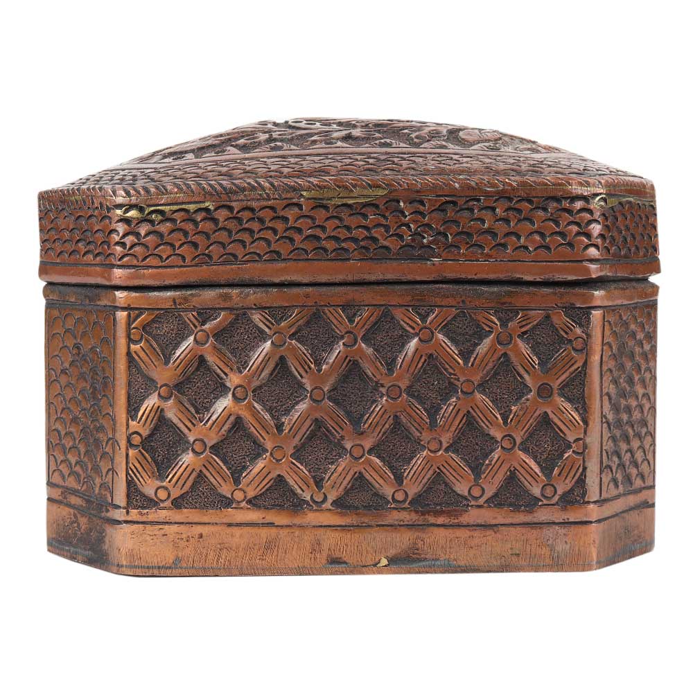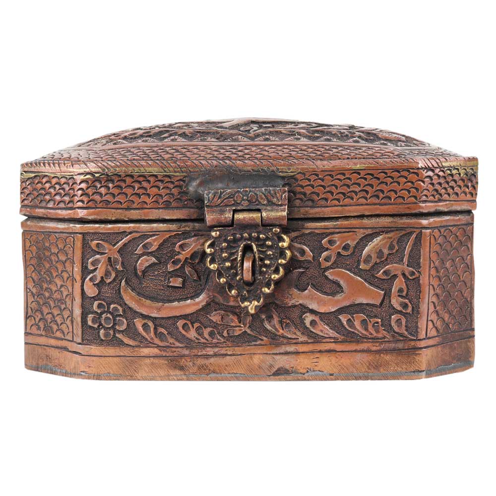 This lovely box appears to be made of copper. It has a beautiful embossed pattern on the entire surface of the box .It has a hinged lid and a latched closure. Store your valuables, jewelery and important documents in this box. It is an ideal gifting option for friends and relatives.