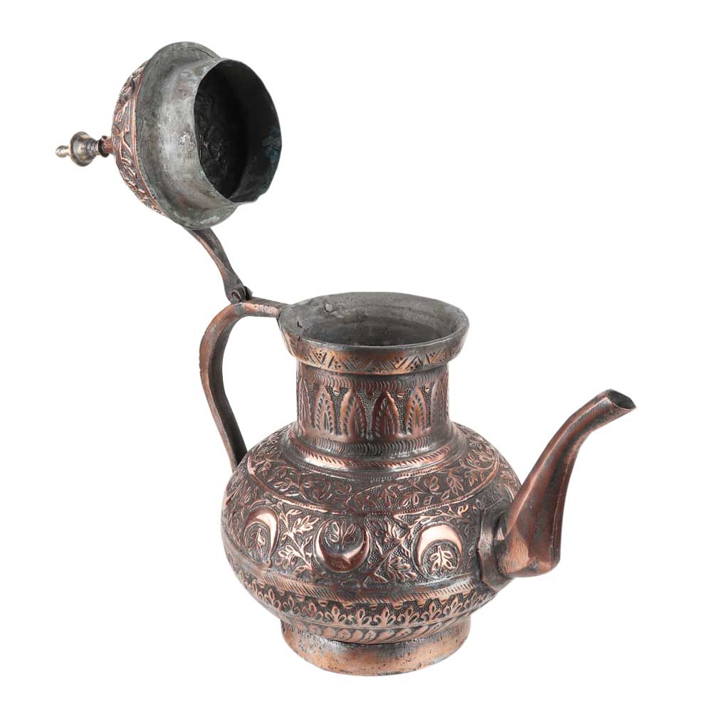 Traditional copper Tea pot with Persian metal work design. The pot is carved in relief with scalpel or pen like tool with some fine leafy and floral pattern on the upper belly as well as the lid. It has a stout and a handle .A lovely home decoration and gifting product.