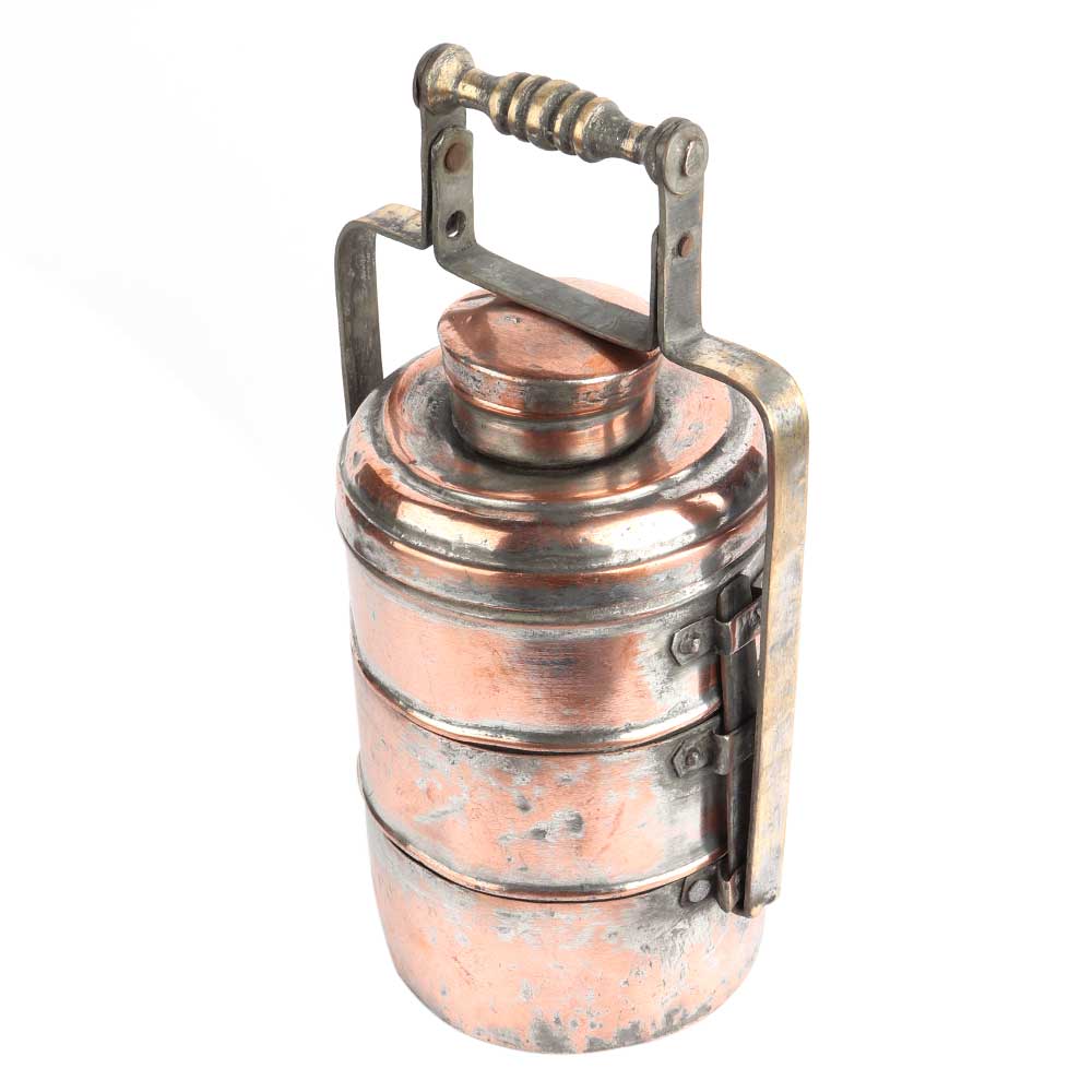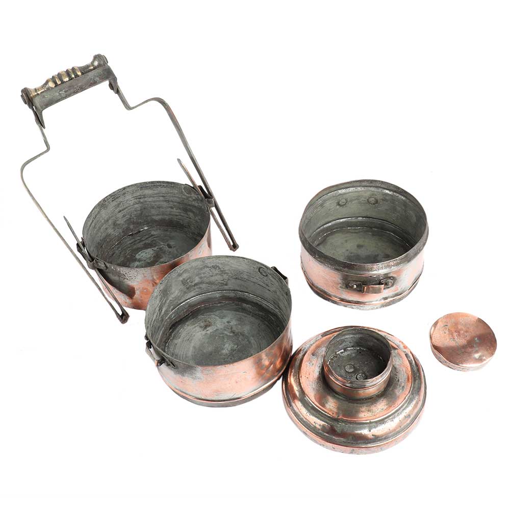 Copper Three Container Lunch Box is used for carrying lunch in offices and schools. Now used for jewelry storage, Diwali gift, New year gift or wedding gift.