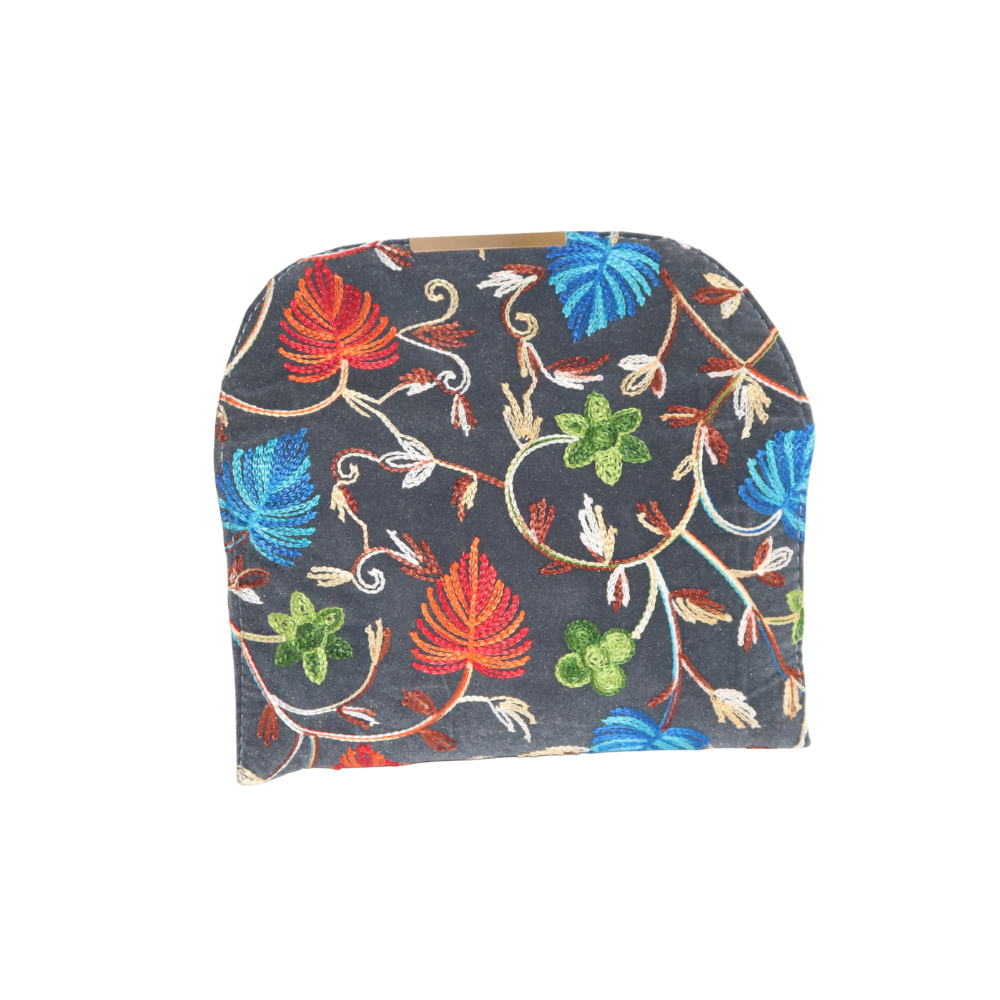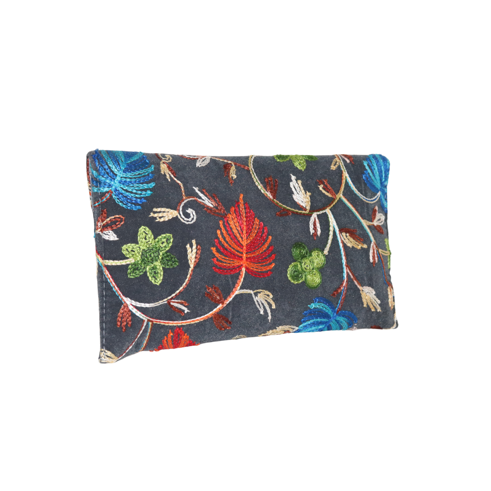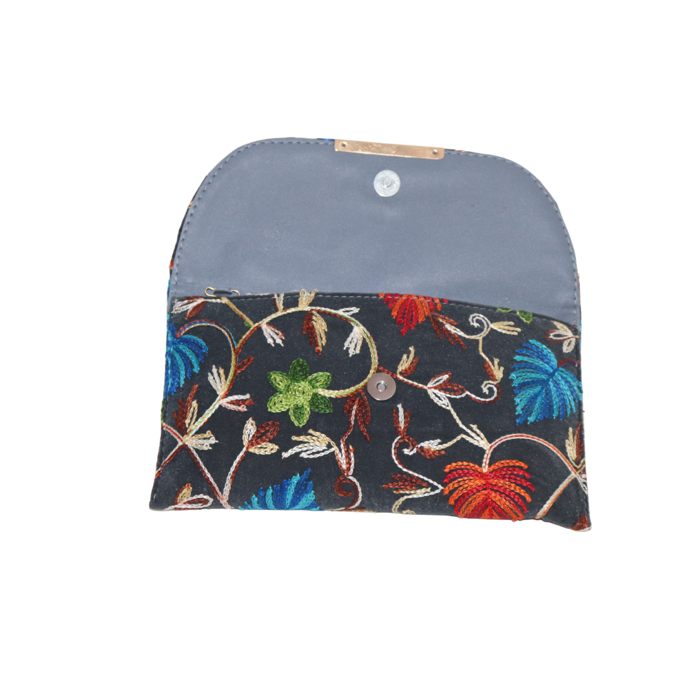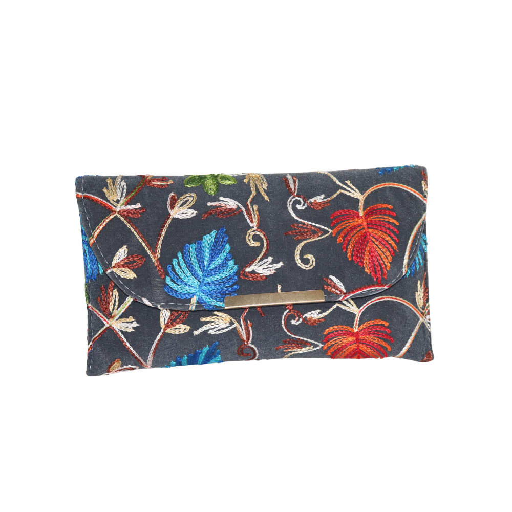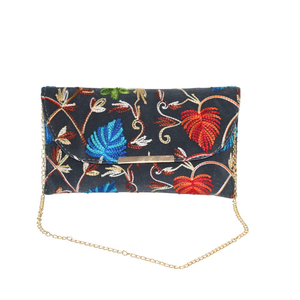 Add a burst of color to your collection with this exquisite handmade cotton clutch, featuring a beautiful floral embroidery design. The striking combination of red, blue, and green flowers stands out against the rich black cotton fabric, creating a bold and elegant look. Perfect for weddings, parties, or evening events, this clutch offers both style and functionality. The soft cotton material ensures comfort while the gold chain strap adds a touch of sophistication, allowing you to carry your essentials with ease. Whether you’re attending a formal event or dressing up for a night out, this clutch will elevate any outfit. The intricate embroidery showcases superior craftsmanship, making it a unique and timeless accessory. This handcrafted beauty is perfect for those who want to make a statement while adding a vibrant touch to their ensemble.