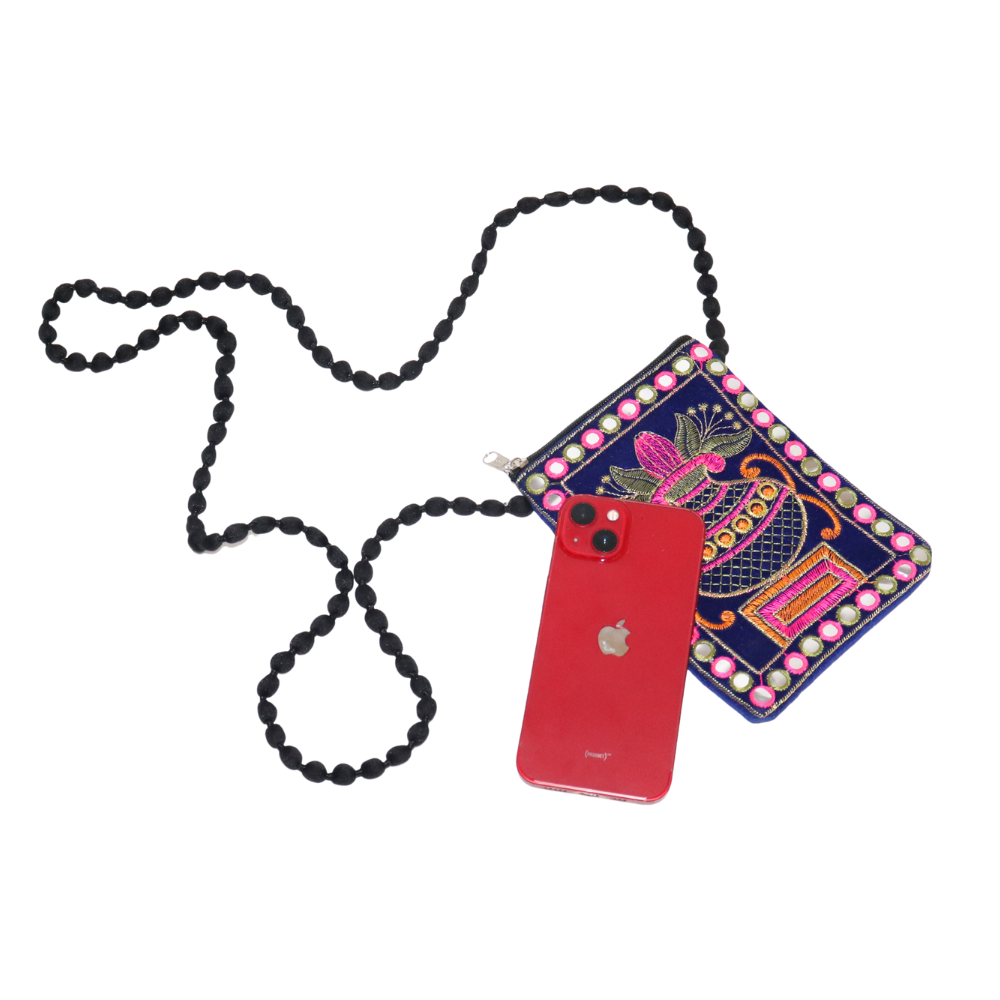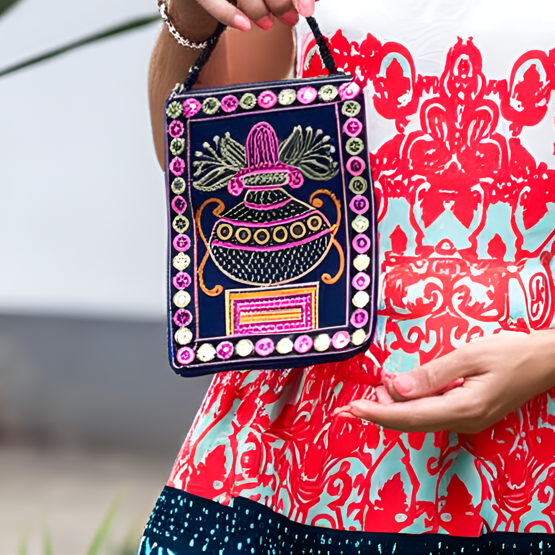 Embrace vibrant artistry with this handmade cotton bag featuring intricate mirror work and colorful embroidery. The eye-catching design showcases a traditional pot motif, framed with stunning pink and silver mirrors. The deep blue cotton fabric offers a perfect backdrop for the bold, colorful stitching, adding a touch of culture and style to your look. The unique beaded black chain enhances its charm, making it easy to carry this piece for any occasion. Whether for a casual outing, a special celebration, or as a statement accessory, this bag offers both beauty and functionality. Handcrafted with attention to detail, it’s a perfect blend of modern style and traditional craftsmanship. With a secure zip closure, your essentials stay safe while you enjoy the spotlight.