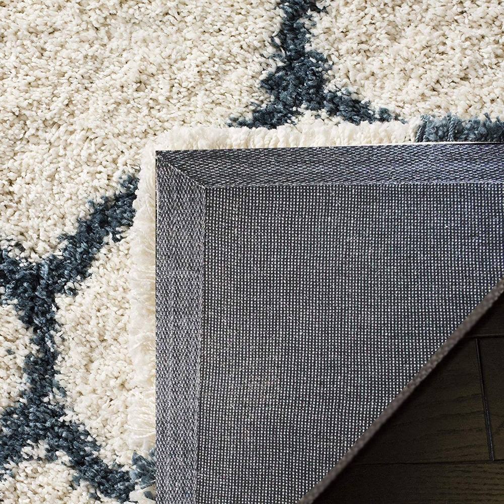 Add elegance and comfort to your interiors with this Ivory & Slate Blue microfiber shaggy rug. The trellis pattern combines modern charm with cozy texture, making it a stunning addition to bedrooms, lounges, or boutique displays. Packed & quality-checked by Indianshelf.