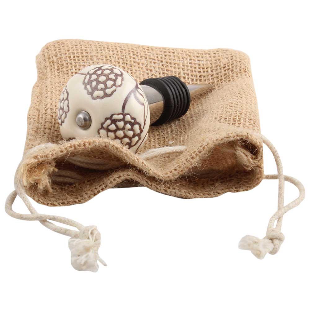 Cream Brown Marigold Etched Ceramic Wine Stopper.zinc alloy wine bottle stopper with attractive Jute Bag Packaging.