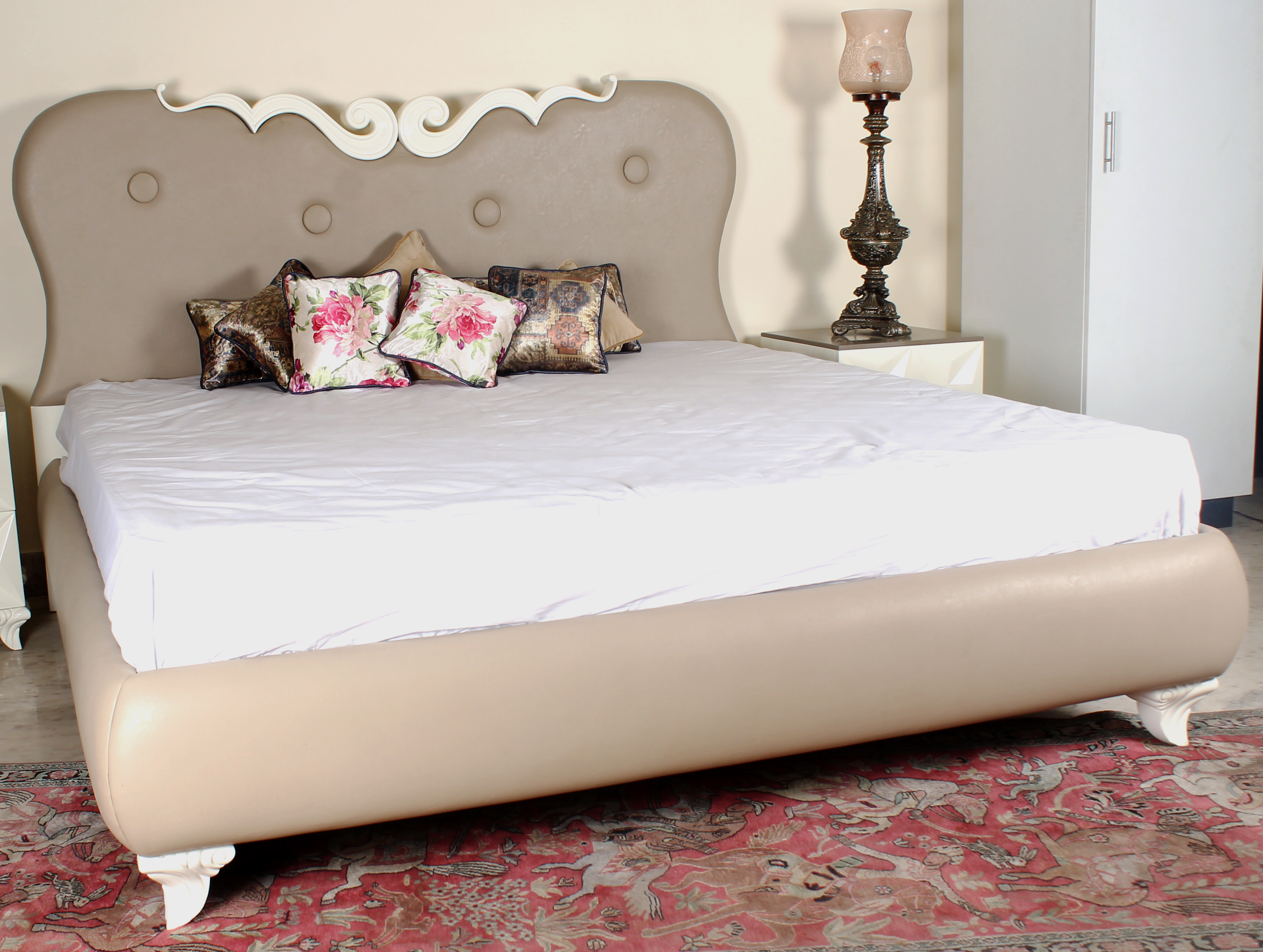 Eclectic Bed with a headboard that has a combination of carved wood pattern in white duco and is fabric clad with unique tufting detail of oversized buttons. Legs of both side tables and the bed matches to give a sense of harmony and uniformity .