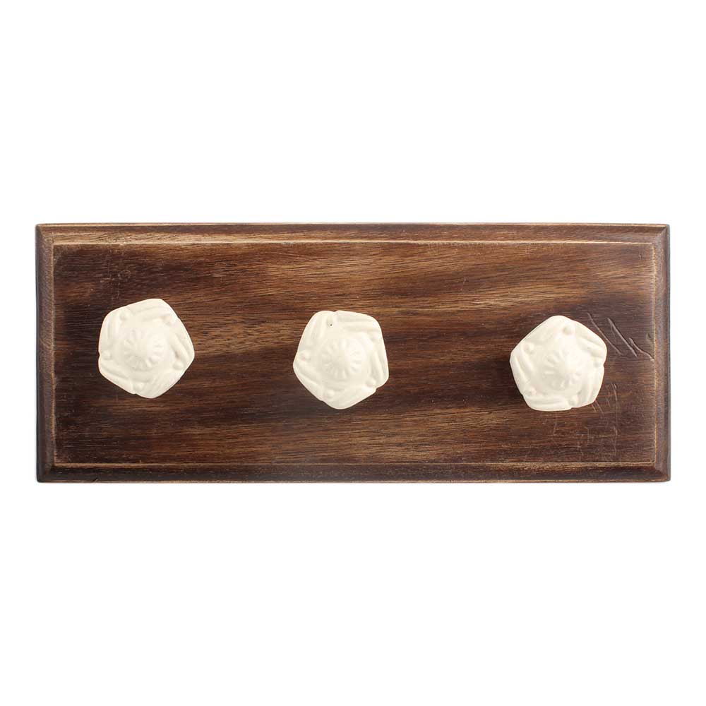 Cream Flower Metal Wooden Hook. A Perfect Complement to the Soft Tone of the Wood are these White Traditional Hat & Coat Hook Made of Genuine Porcelain and Brass. It can be use to Hang Jewellery, Leashes, Towels, Scarves, Light Weight Sweaters, Caps Etc.