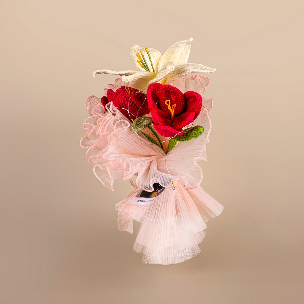 This maroon bloom bunch is lovingly crafted from soft acrylic yarn, fibre filling and craft wire, offering a vintage hint. Perfect for craft aficionados, it exudes hand-crafted charm and lasting appeal. Packed and quality-checked by Indianshelf. Each stitch is a testament to traditional artistry.