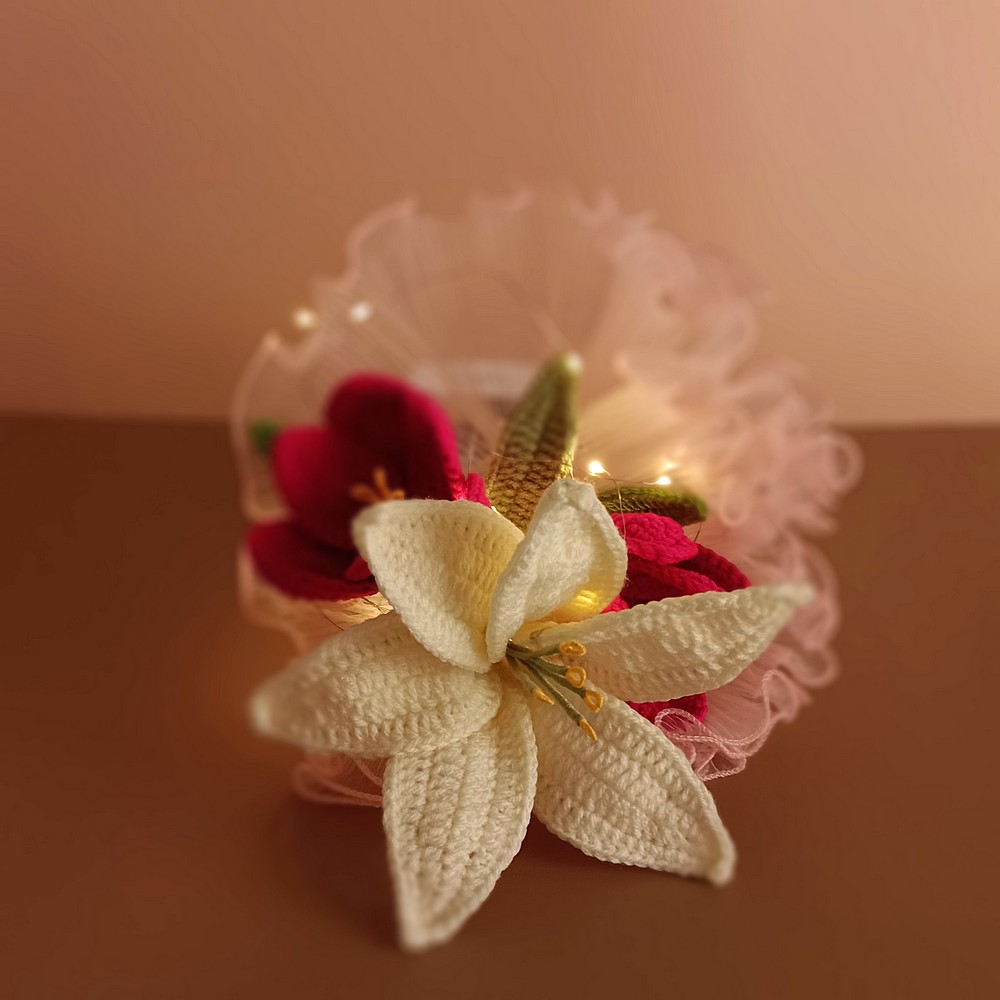 Keep your maroon crochet piece away from moisture and direct sun to prevent dust and fading. Dust gently with a soft brush or a hairdryer on cool, and reshape stems carefully if needed.
