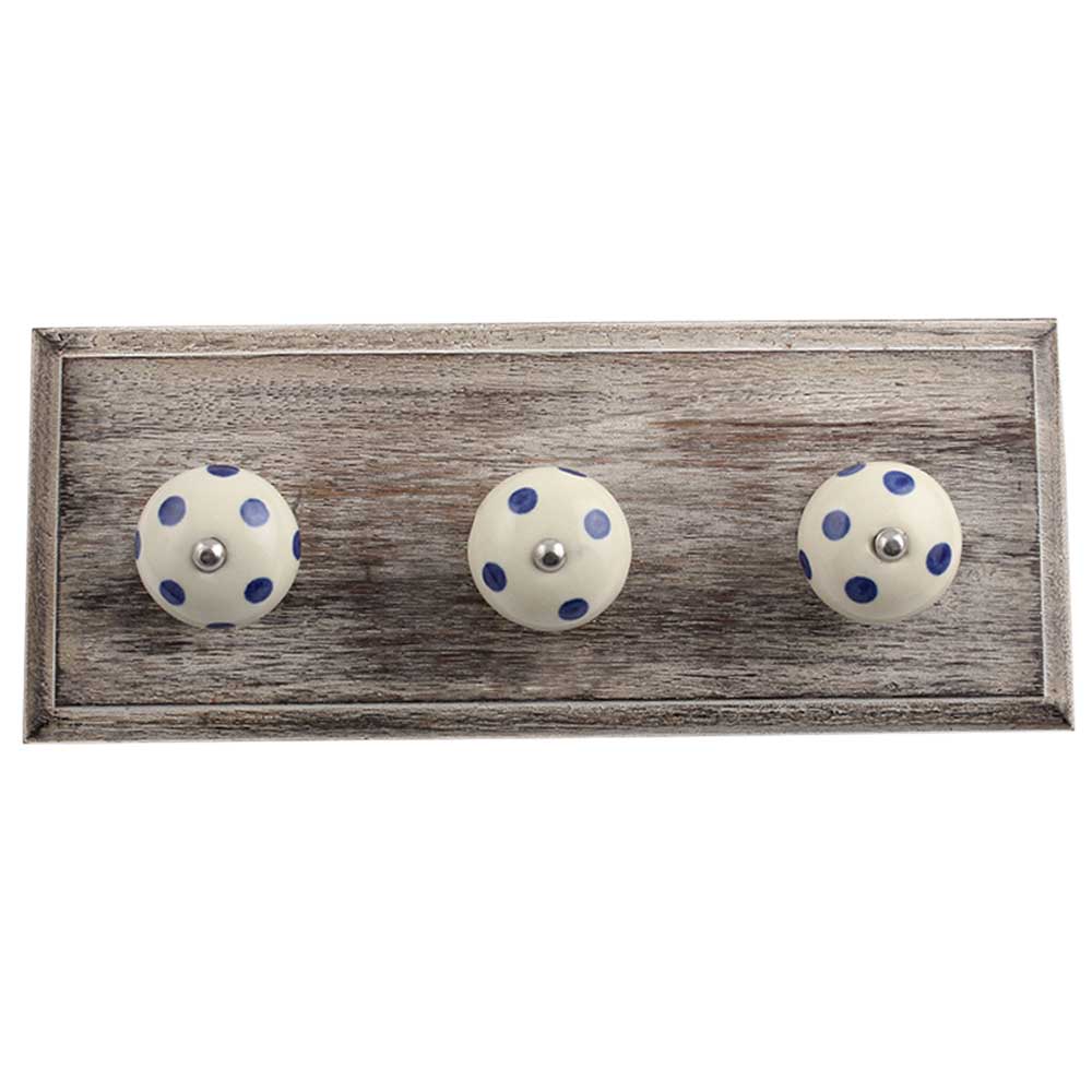 Cream Navy Blue Dot Wooden Hooks. A Perfect Complement to the Soft Tone of the Wood are these White Traditional Hat Coat Hook Made of Genuine Porcelain and Brass. It can be use to Hang Jewellery, Leashes, Towels, Scarves, Light Weight Sweaters, Caps Etc.