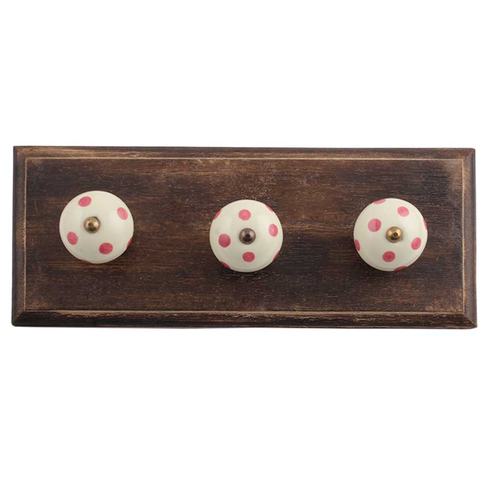 Cream Pink Dot Wooden Hooks . A Perfect Complement to the Soft Tone of the Wood are these White Traditional Hat Coat Hook Made of Genuine Porcelain and Brass. It can be use to Hang Jewellery, Leashes, Towels, Scarves, Light Weight Sweaters, Caps Etc.