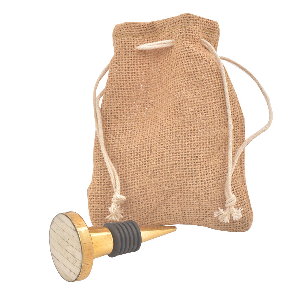 Cream Round Metal And Bone Wine Stopper. Zinc Alloy Wine Bottle Stopper with Attractive Jute Bag Packaging.