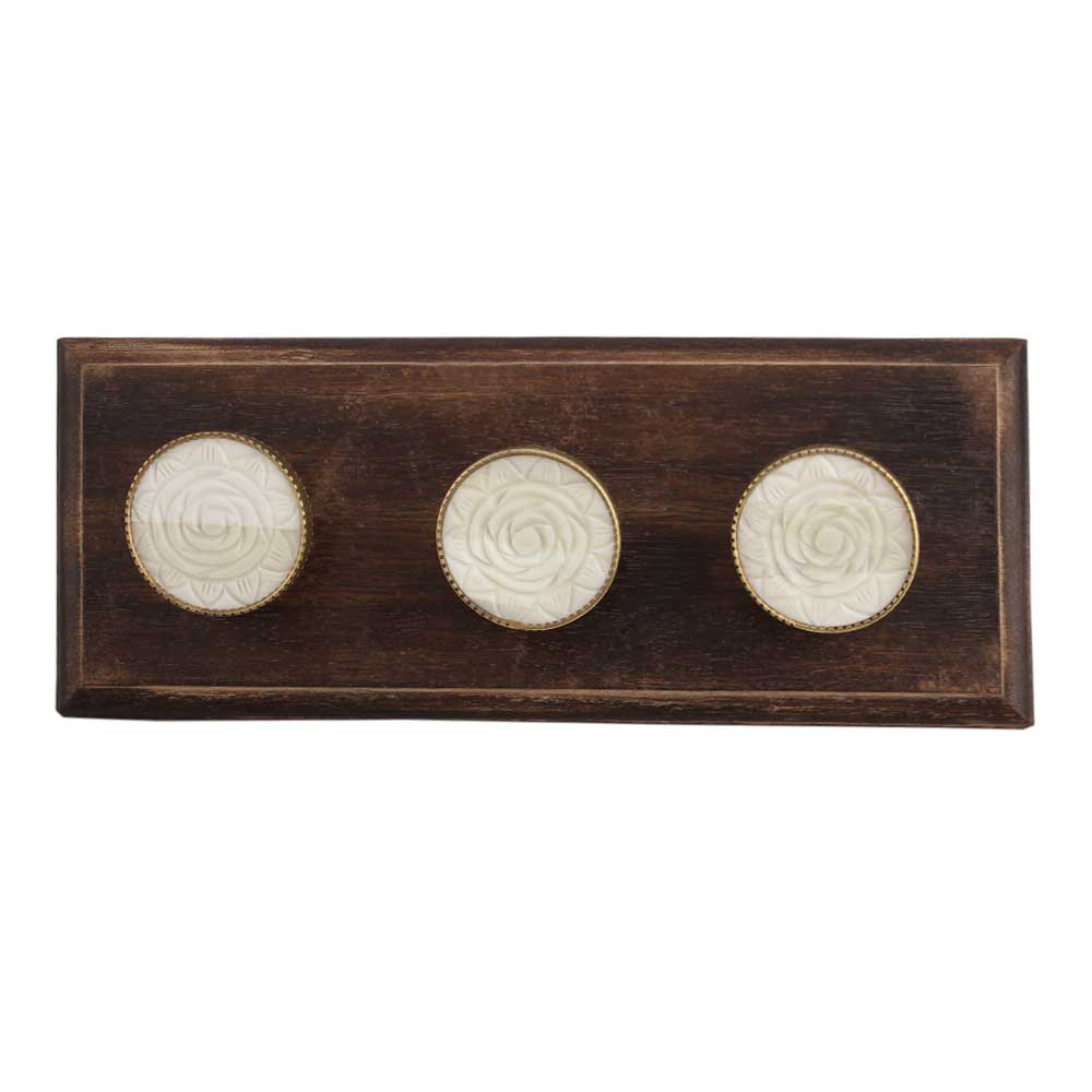 Cream Round Rose Bone and Metal Wooden Hook. A Perfect Complement to the Soft Tone of the Wood are these White Traditional Hat & Coat Hook Made of Genuine Porcelain and Brass. It can be use to Hang Jewellery, Leashes, Towels, Scarves, Light Weight Sweaters, Caps Etc.