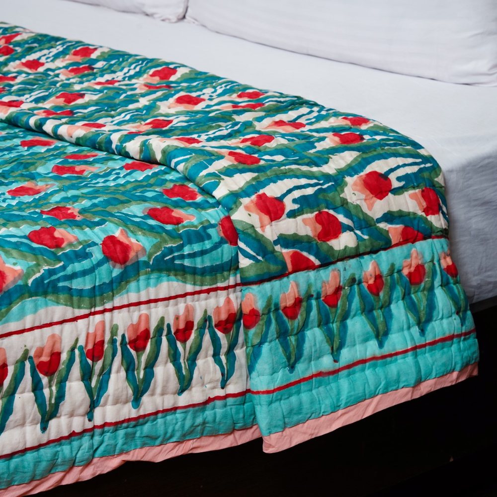 This turquoise and red Malmal (Voile) quilt captures the essence of Rajasthani hand-block artistry with its bold floral patterns and refreshing tones. Crafted from ultra-soft cotton voile, it offers the perfect blend of elegance and comfort. Expertly handmade and quality-checked by Indianshelf, this quilt brings color and craftsmanship to every home.
