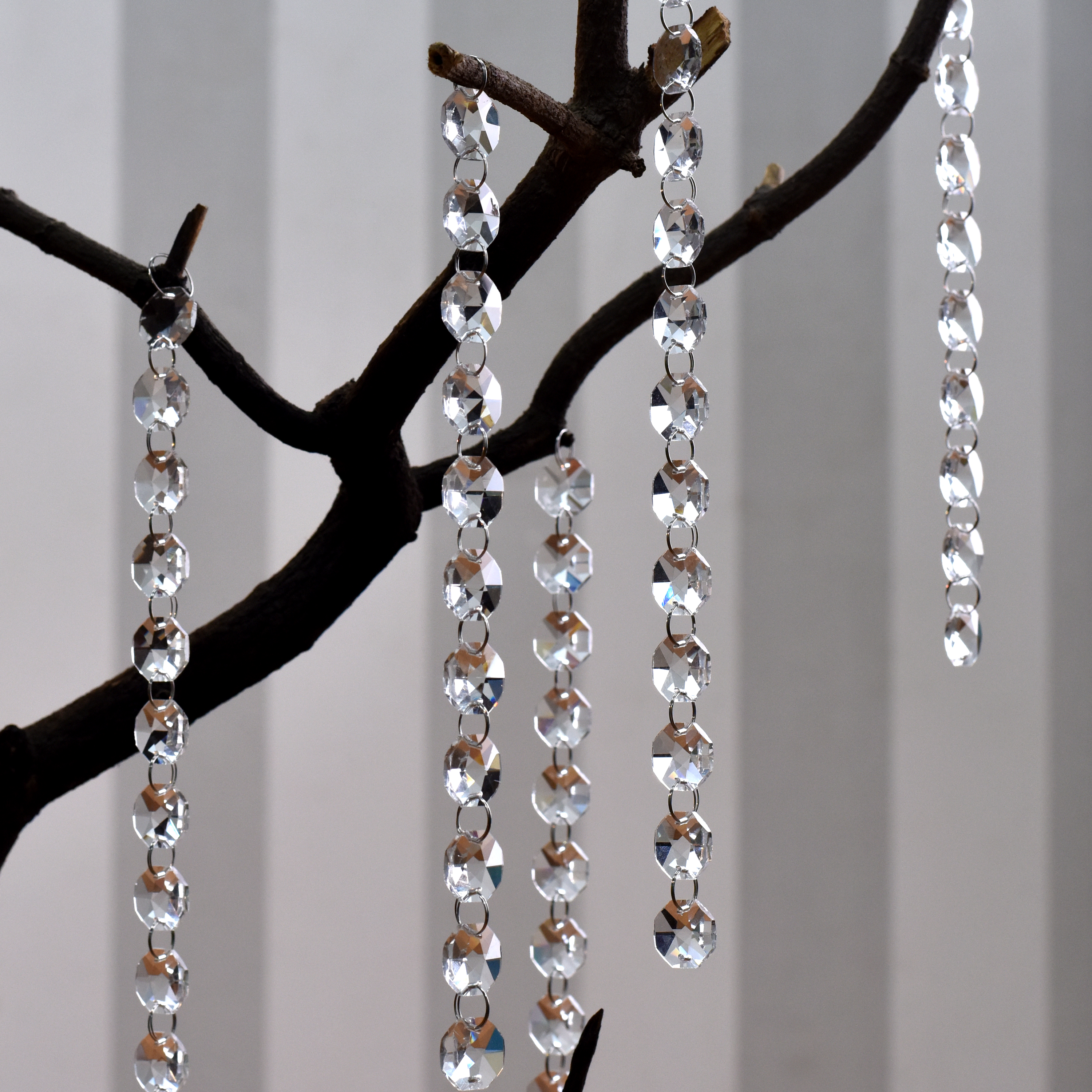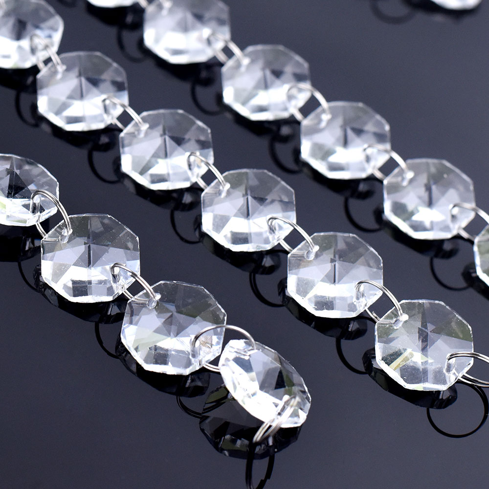 With this stunning crystal garland strand, you can have a stylish wedding. It can be used to decorate a floral display, make a crystal curtain, have a center piece wishing tree, or decorate a table. Each garland contains 50 crystal clear glass beads. This is the same type of crystal that is used to adorn antique and vintage crystal chandeliers. Crystal glass beads have a brilliant faceted edge that catches the light, making them pure and sparkly. High hardness, difficult to scratch. Metal rings hold the crystal strands together, allowing you to easily adjust the length and width of the strands.