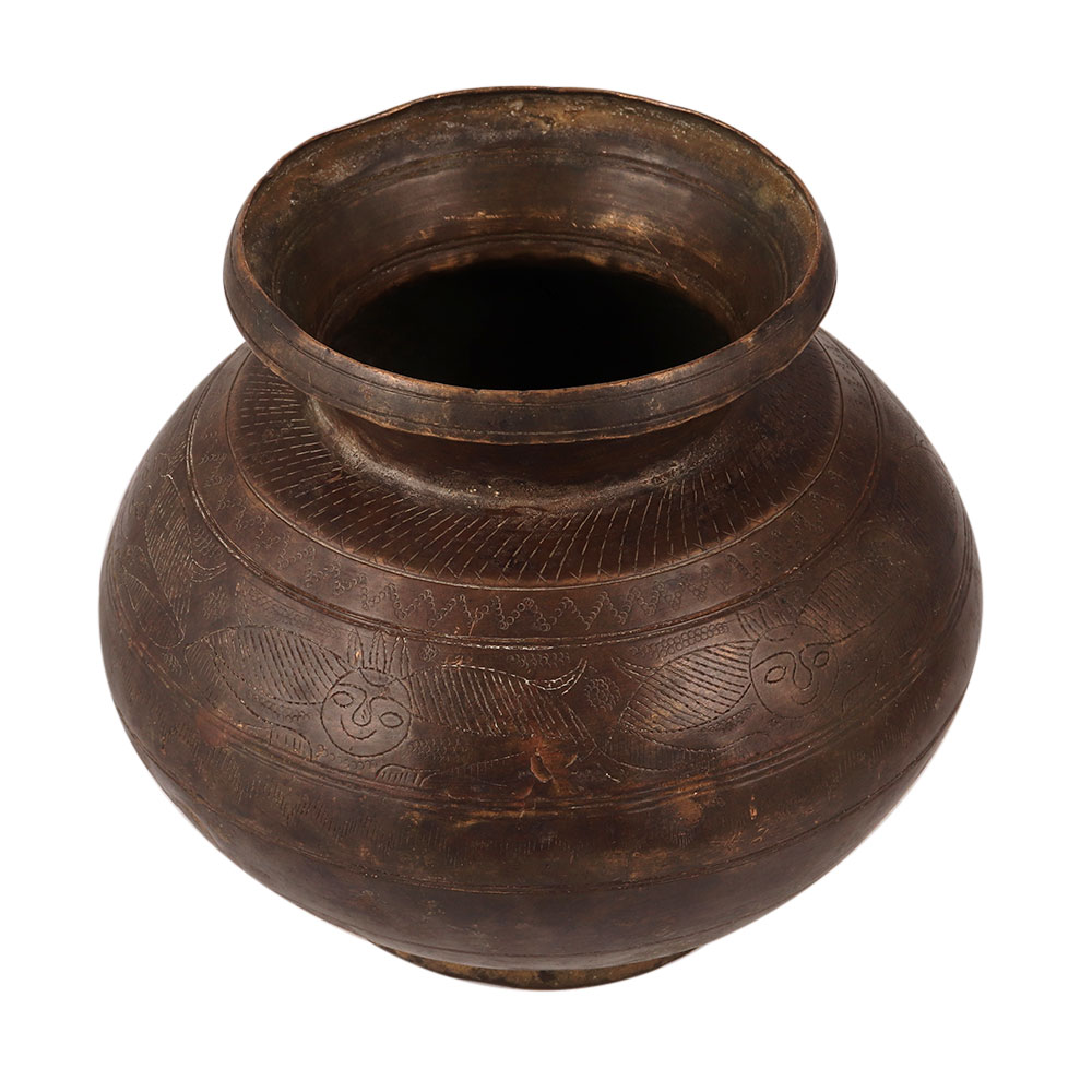 Embrace tradition and elevate the ambiance with a captivating brass water pot. This brass water pot with antique dark brown finish is an epitome of traditional craftsmanship and elegance. This masterpiece is handcrafted by skilled Indian artisans, showcasing their expertise and attention to detail. Its enchanting designs engraved on the surface add a touch of opulence, making it an irresistible piece for decoration. Since centuries, this brass water pot has held an important place in Indian households. It has been used to offer water to deities, the sun god, and the Shivling. It serves as a vessel to store sacred water from the holy river Ganga, adding sanctity to rituals, auspicious functions, and havans in Hindu traditions. Beyond its spiritual significance, this water pot doubles as an exquisite indoor flower pot, enhancing the decor of your living room or patio garden. The rich heritage and cultural symbolism make it a meaningful and memorable gift for your loved ones on special occasions, festivals, or auspicious events.