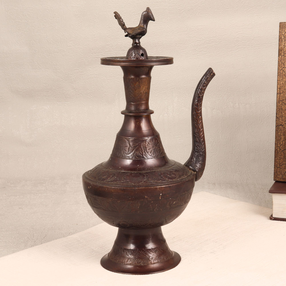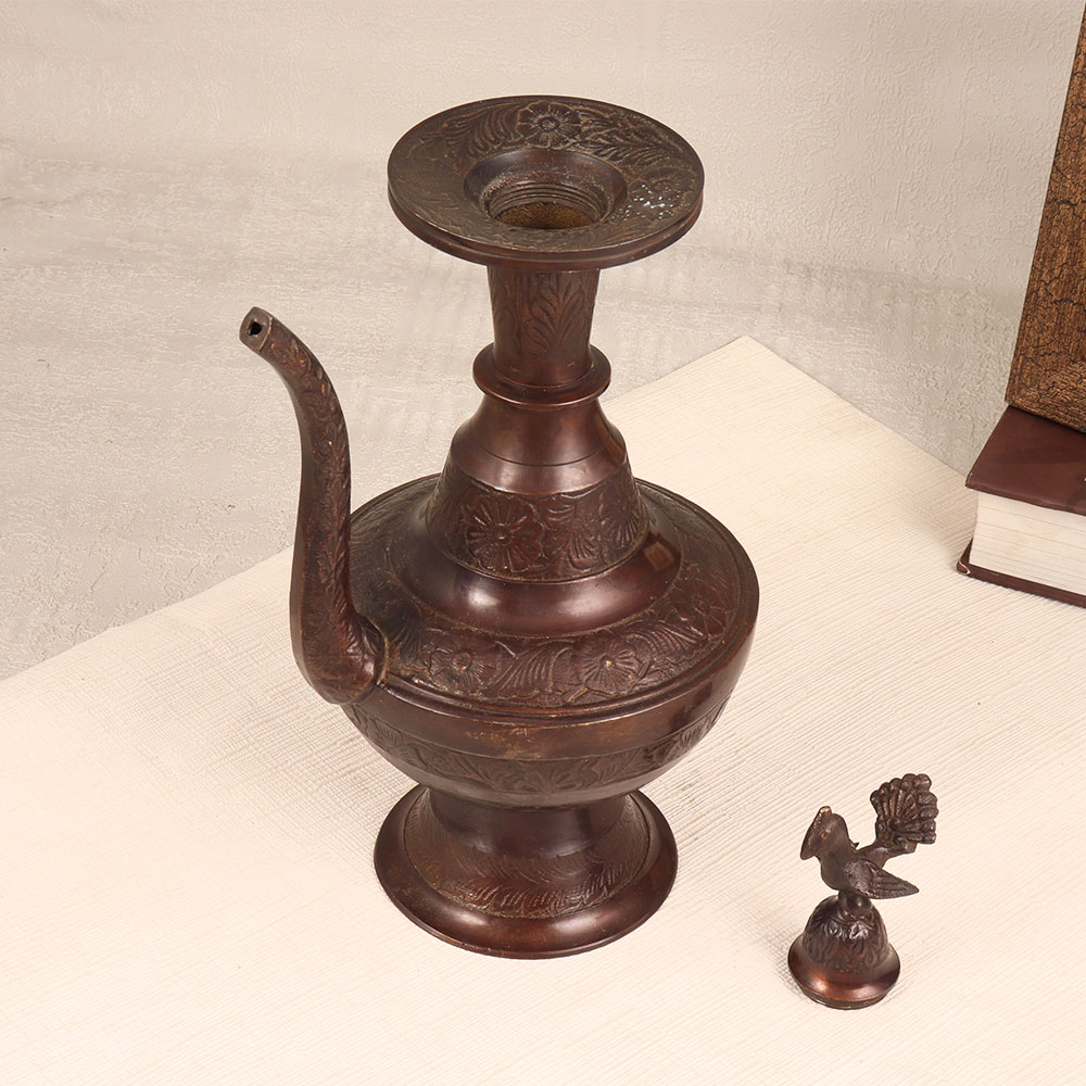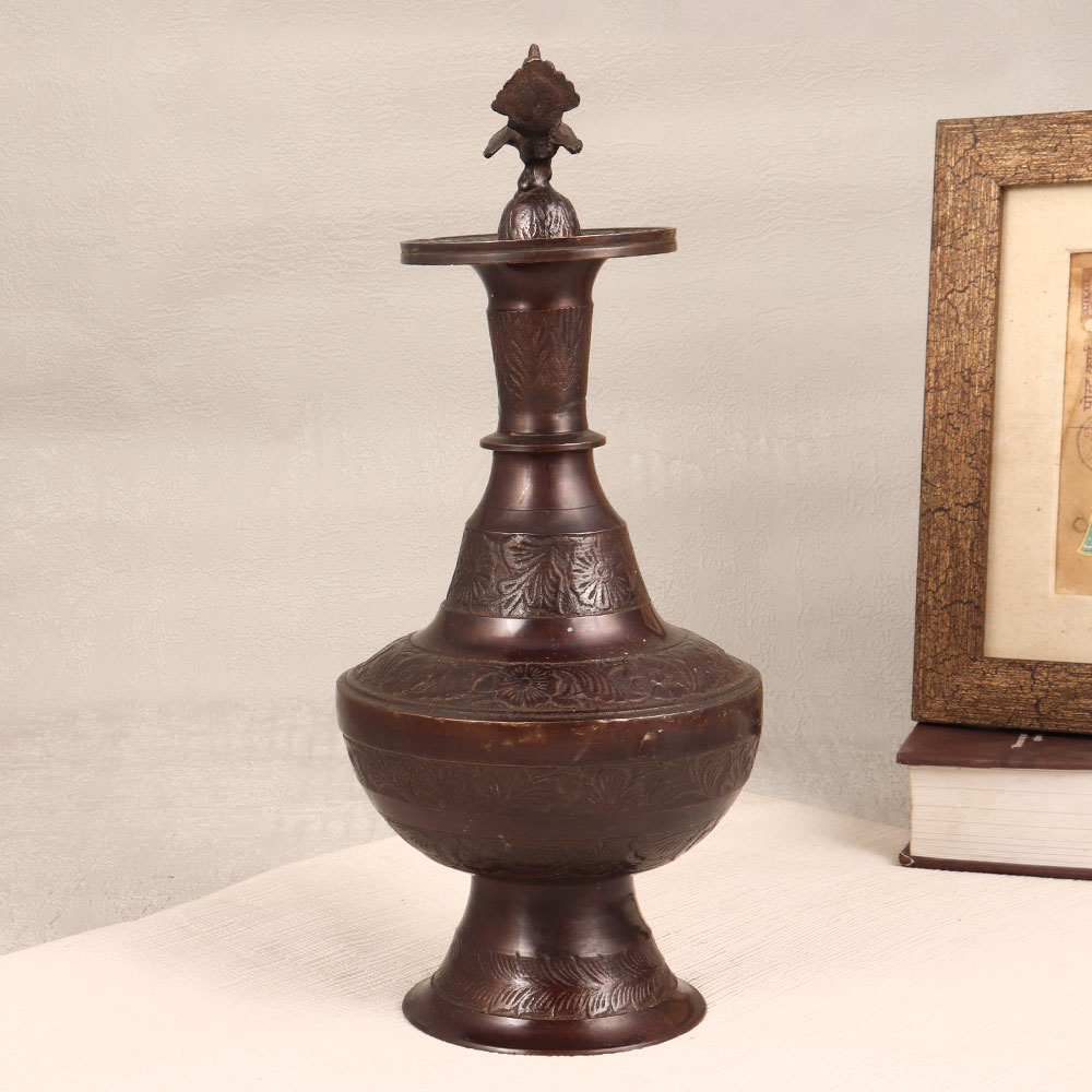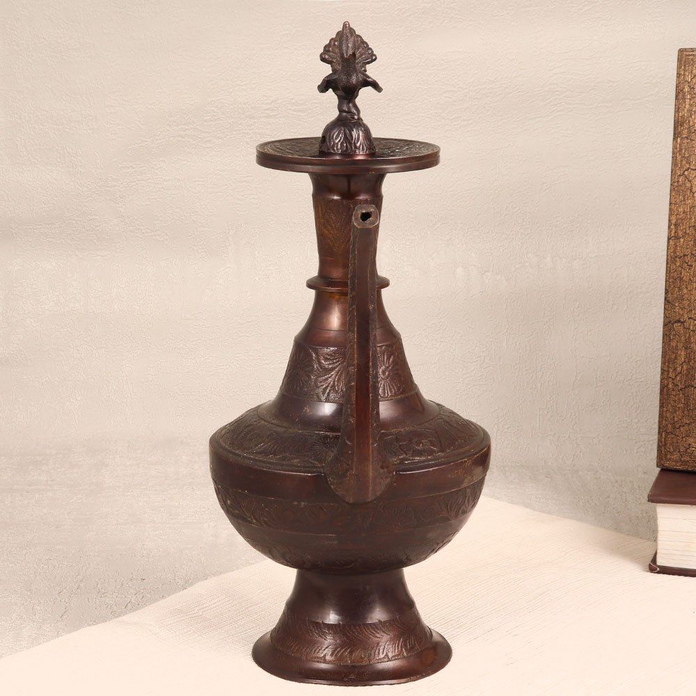 Adorn your living space with the charm of our Handmade Brass Water Pot. Skillfully crafted by Indian artisans, this pot boasts a timeless design that seamlessly blends traditional artistry with functionality. The pot's exterior is adorned with intricate engravings, showcasing the meticulous craftsmanship that went into its creation. A stunning peacock carving graces the lid, adding a touch of regality to its antique dark brown finish. Made from finest-quality brass, this water pot is not only a testament to artisanal expertise but also a versatile decor piece. Whether adorning your home, office, restaurant, hotel, or cafe, its elegance is sure to captivate. Use it as a sophisticated flower pot to infuse natural beauty into your space or present it as a thoughtful gift on special, festive, or auspicious occasions.